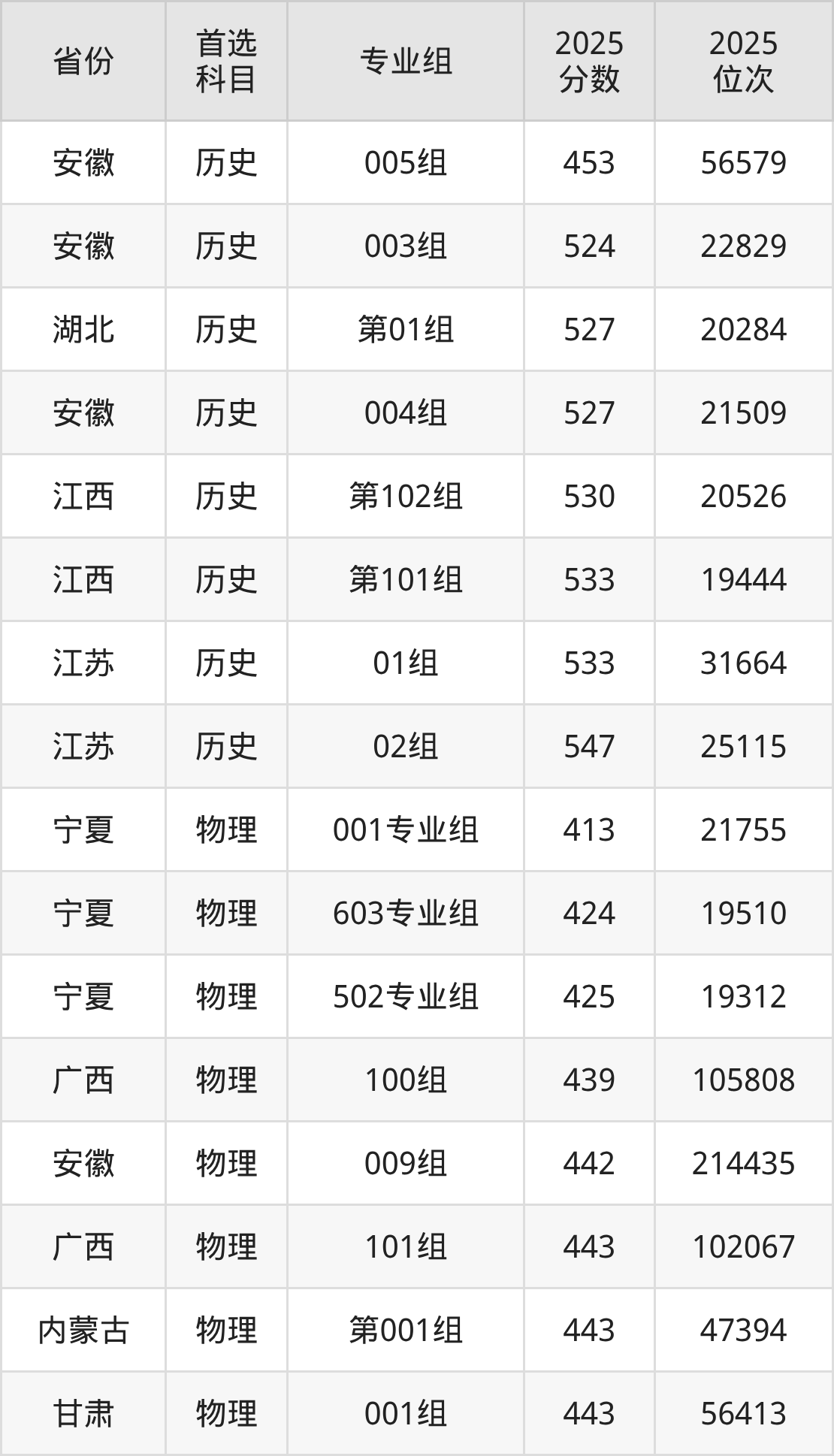 历史类最低分对应地区为安徽(005组),录取位次为56579,超专科线253分;最高分对应地区为江苏(02组),录取位次为25115,超本科线65分。