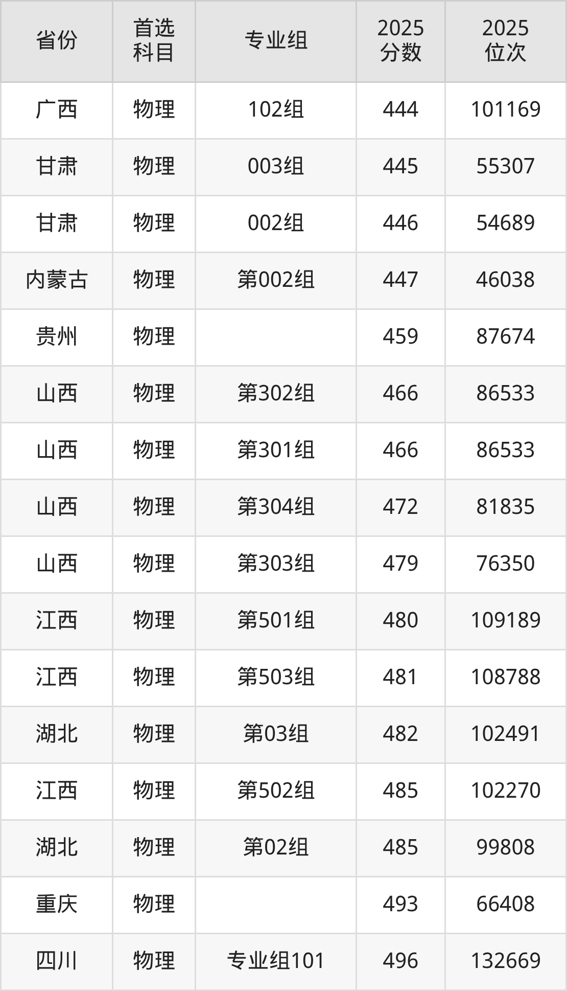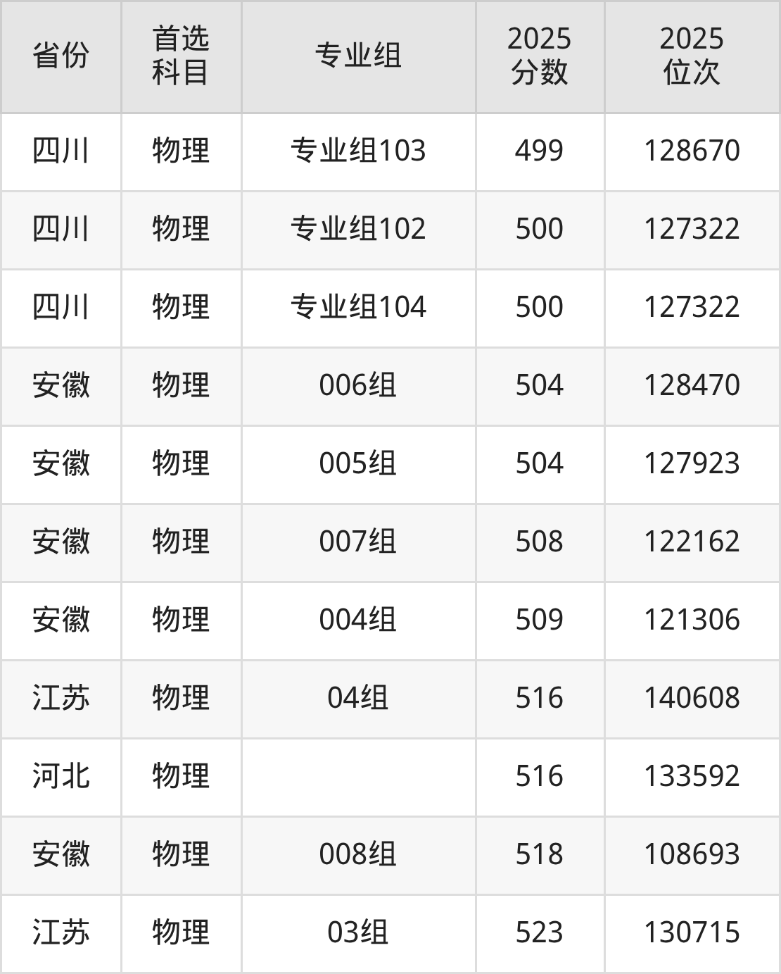 物理类:004组509分、121306名,005组504分、127923名,006组504分、128470名,007组508分、122162名,008组518分、108693名,009组442分、214435名;