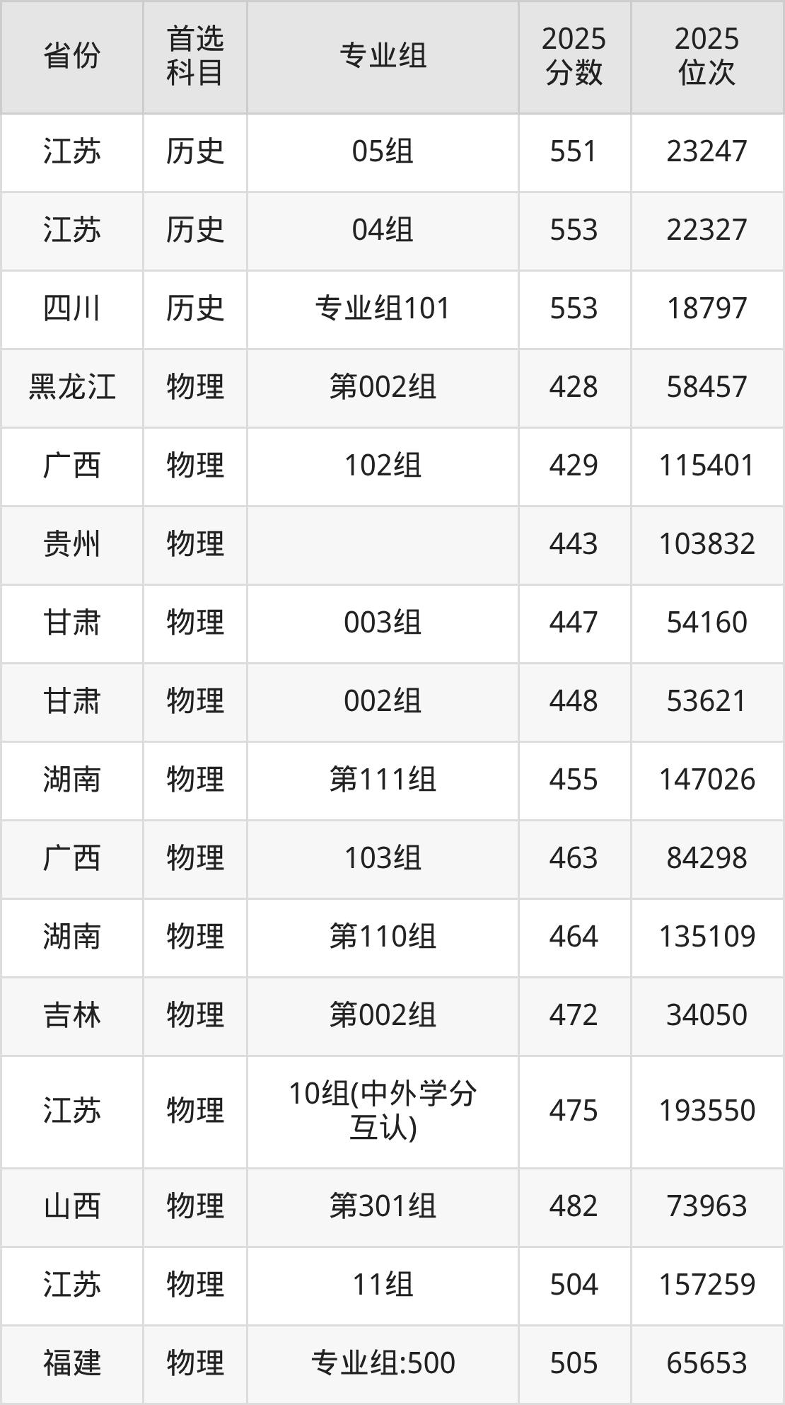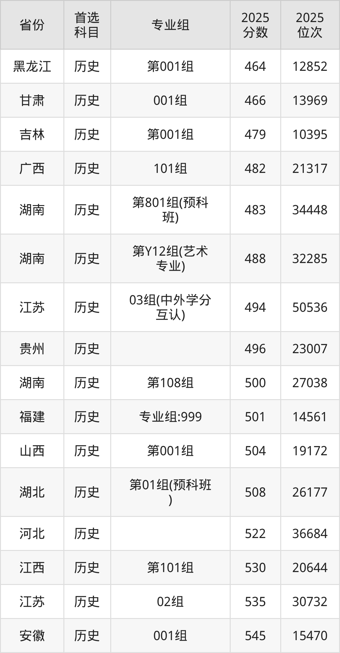 历史类:03组522分、29992名,04组512分、34651名,05组(高校中外联合培养)480分、49649名,06组540分、22032名,07组535分、24139名;