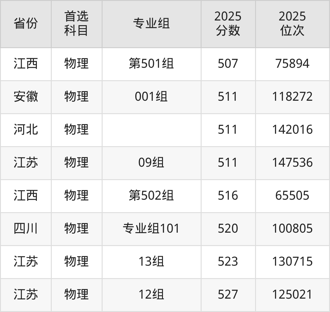 物理类:11组506分、136074名,12组514分、125639名,13组(联合培养)508分、133497名,14组(高校中外联合培养)468分、181000名,15组504分、138642名,16组(联合培养)503分、139962名,17组527分、108843名;