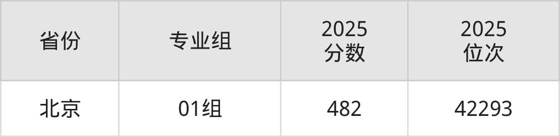 最低分对应地区为北京(01组),录取位次为42293,超本科线52分。
