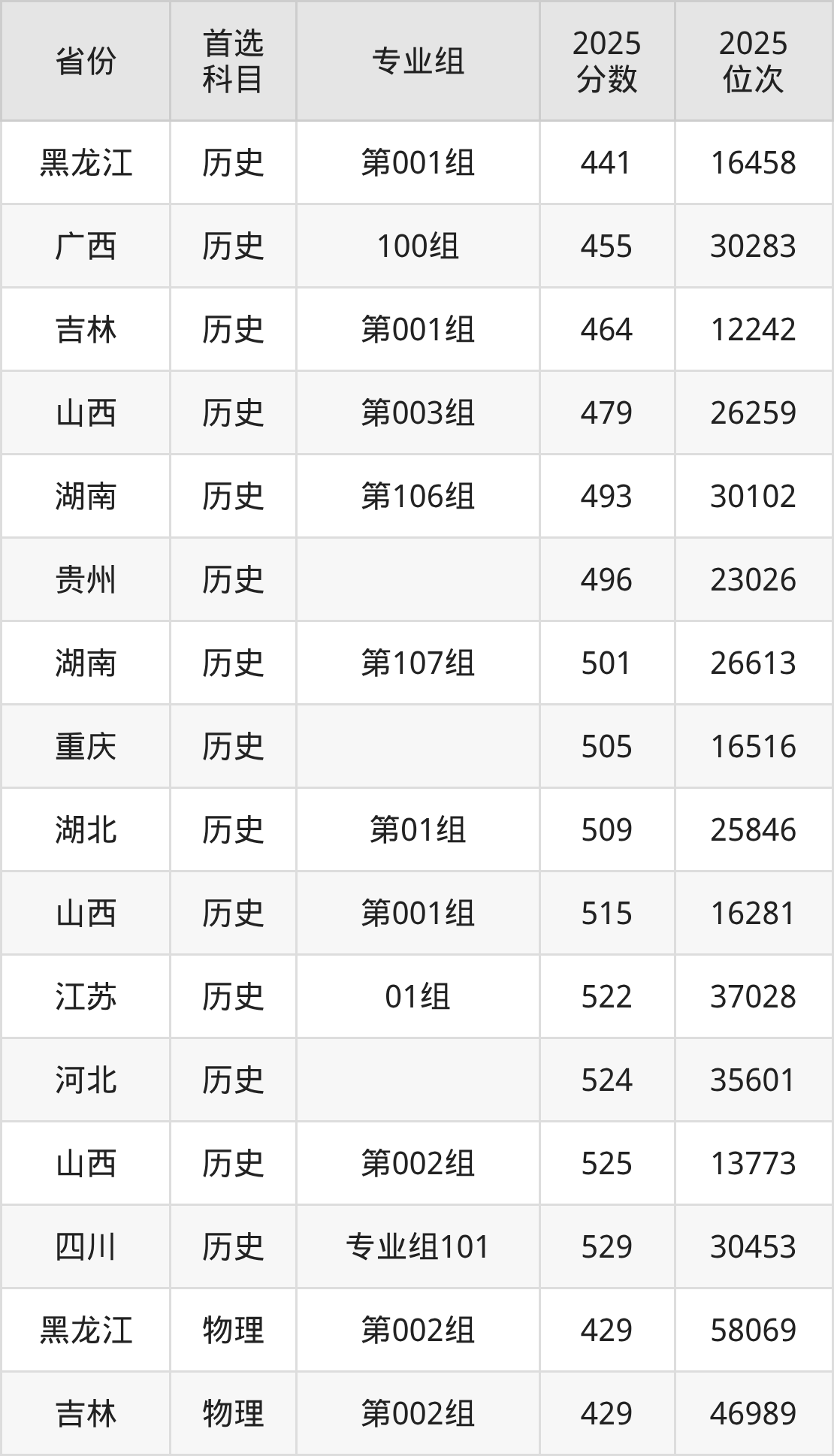 历史类最低分对应地区为黑龙江(第001组),录取位次为16458,超本科线36分;最高分对应地区为四川(专业组101),录取位次为30453,超本科B62分。