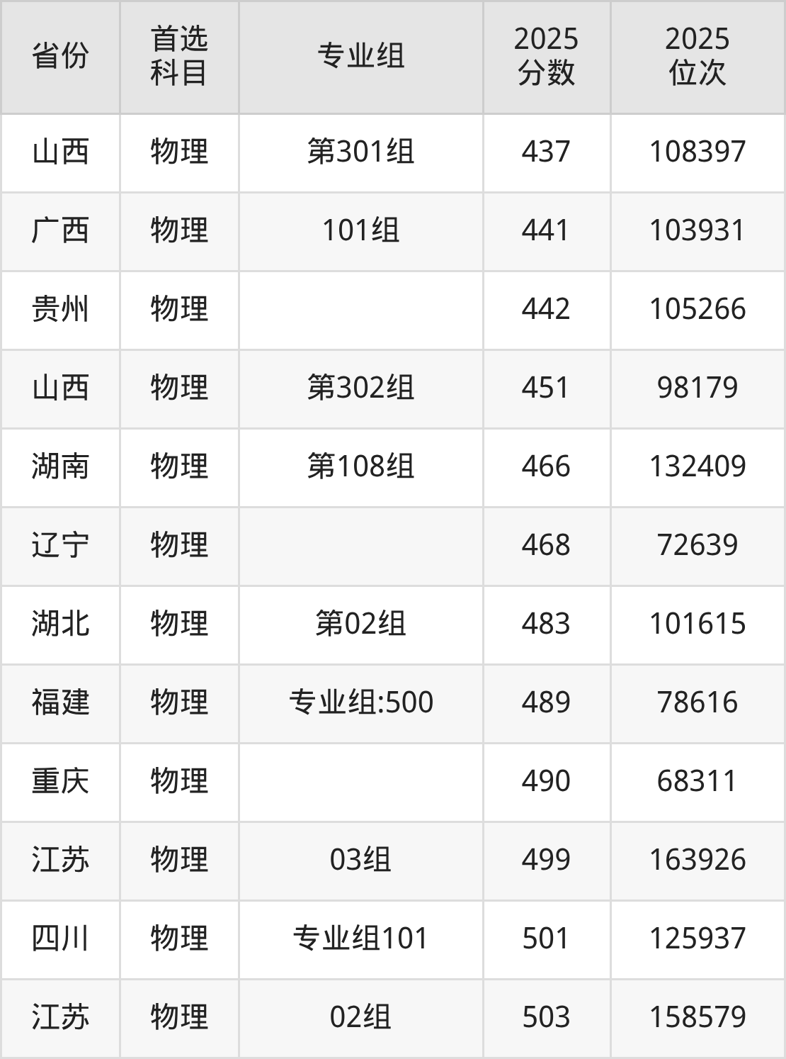物理类最低分对应地区为黑龙江(第002组),录取位次为58069,超本科线69分;最高分对应地区为江苏(02组),录取位次为158579。