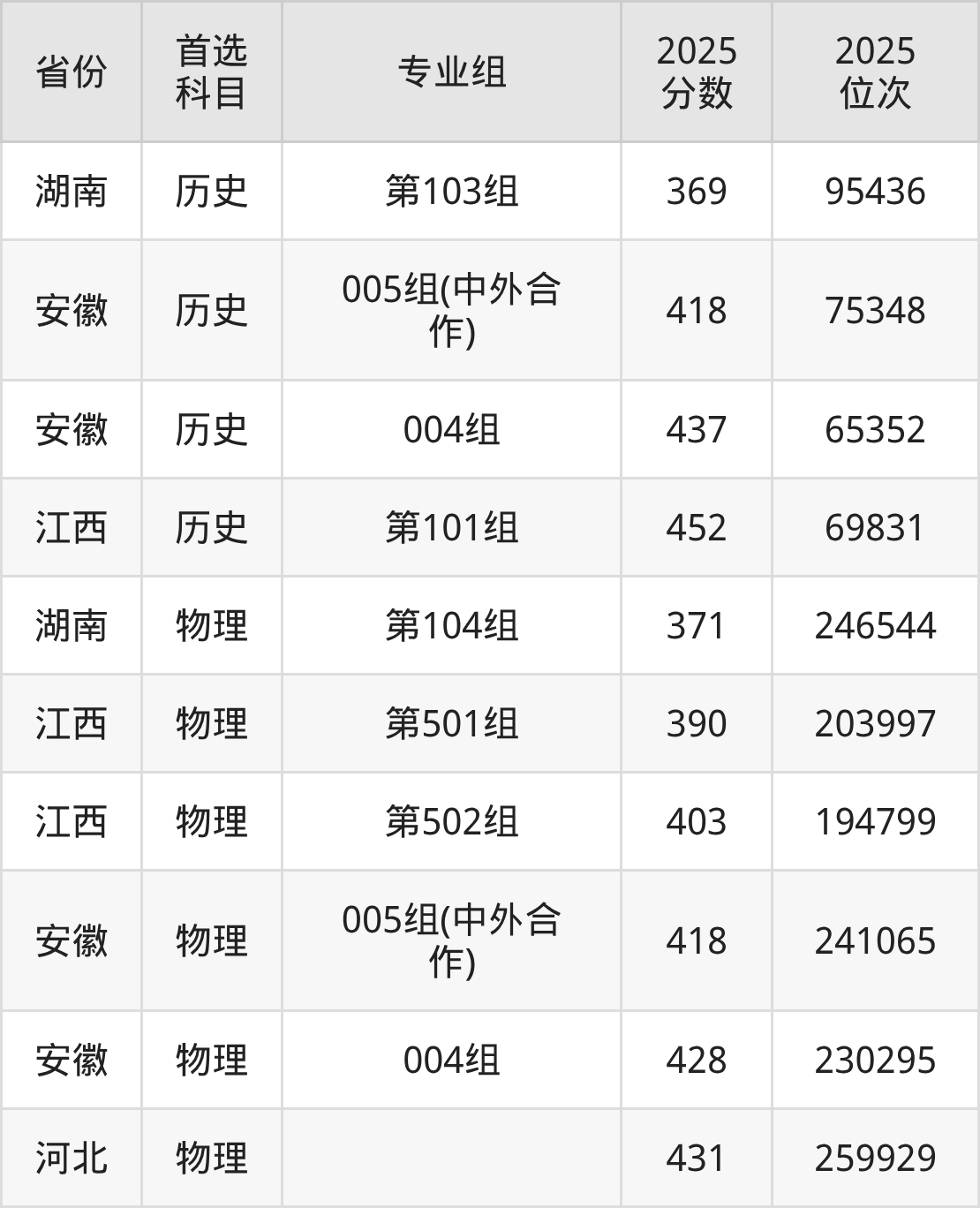 物理类:004组428分、230295名,005组(中外合作)418分、241065名;