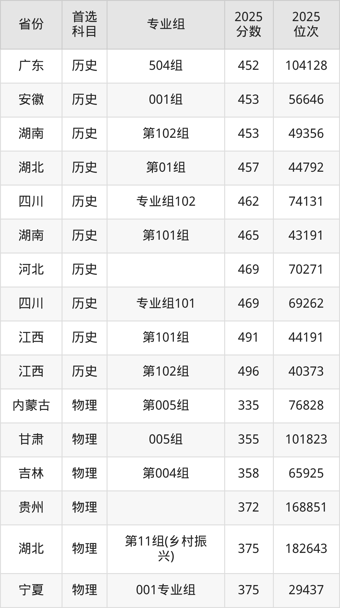 历史类最低分对应地区为湖北(第04组(中外合作)),录取位次为76360,超专科线187分;最高分对应地区为江西(第102组),录取位次为40373,超专科线206分。