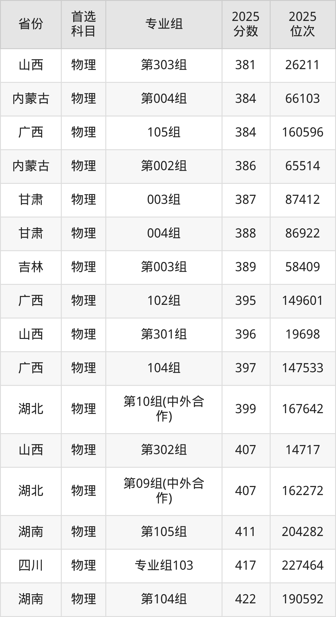 物理类:第06组433分、143353名,第07组433分、143353名,第08组427分、147880名,第09组(中外合作)407分、162272名,第10组(中外合作)399分、167642名,第11组(乡村振兴)375分、182643名,第12组(专本联合培养)436分、141002名,第13组(专本联合培养)430分、145627名;