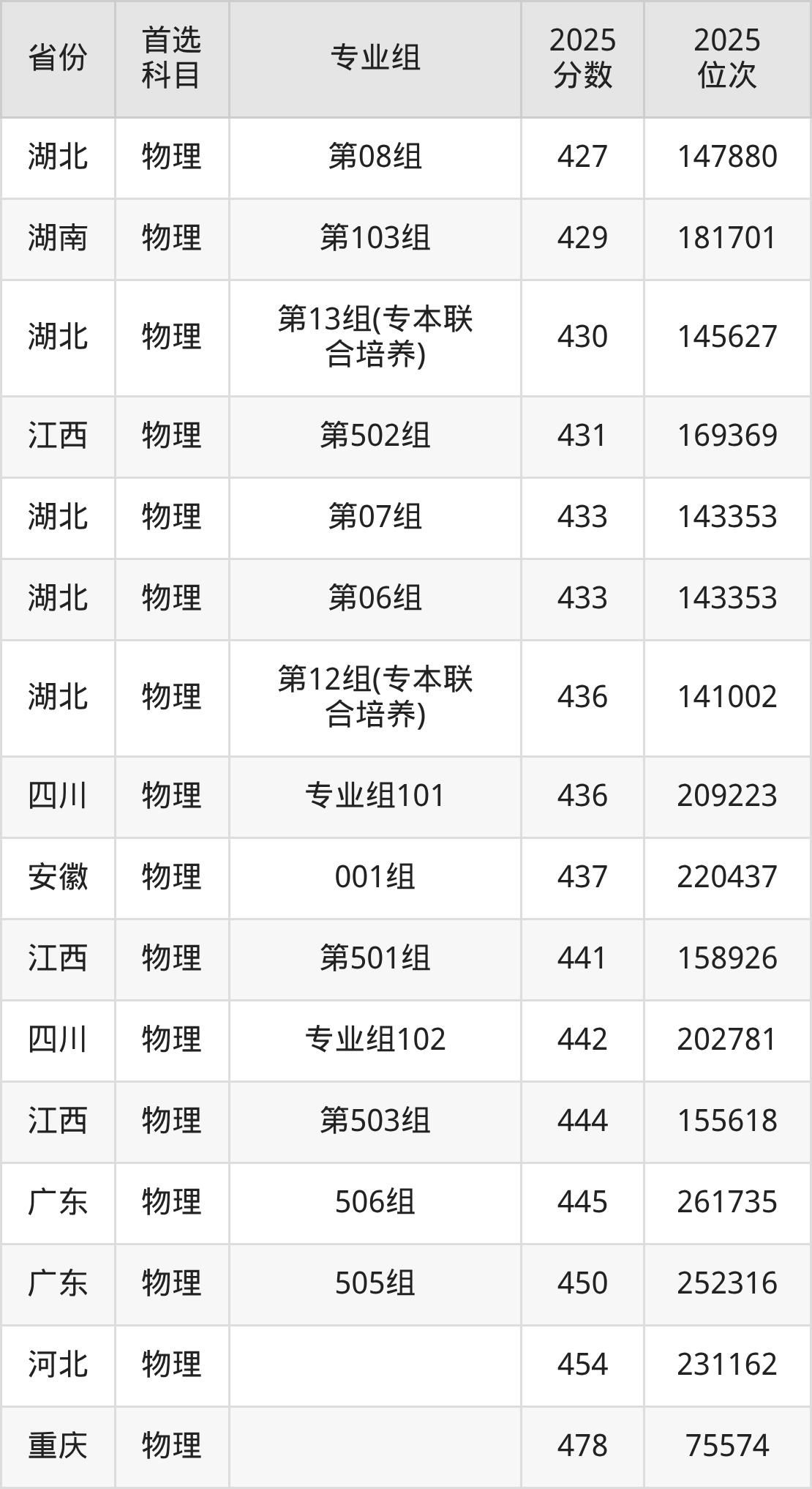 物理类:第07组(乡村振兴)403分、164307名,第08组429分、146179名,第09组427分、147694名,第10组427分、147694名,第11组(中外合作)415分、156178名,第12组(中外合作)399分、166970名,第13组(高职联办本科)436分、141000名,第14组(高职联办本科)432分、143981名;