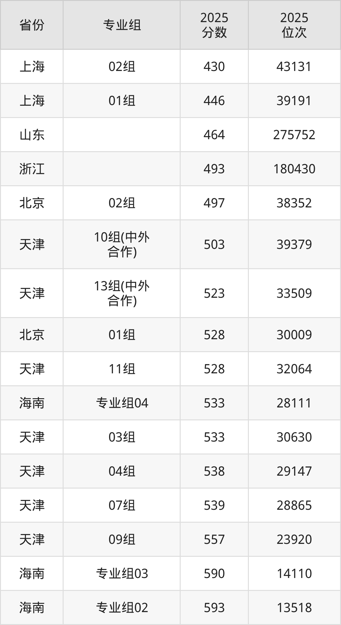 最低分对应地区为上海(02组),录取位次为43131,超本科线28分;最高分对应地区为海南(专业组02),录取位次为13518,超本科线113分。