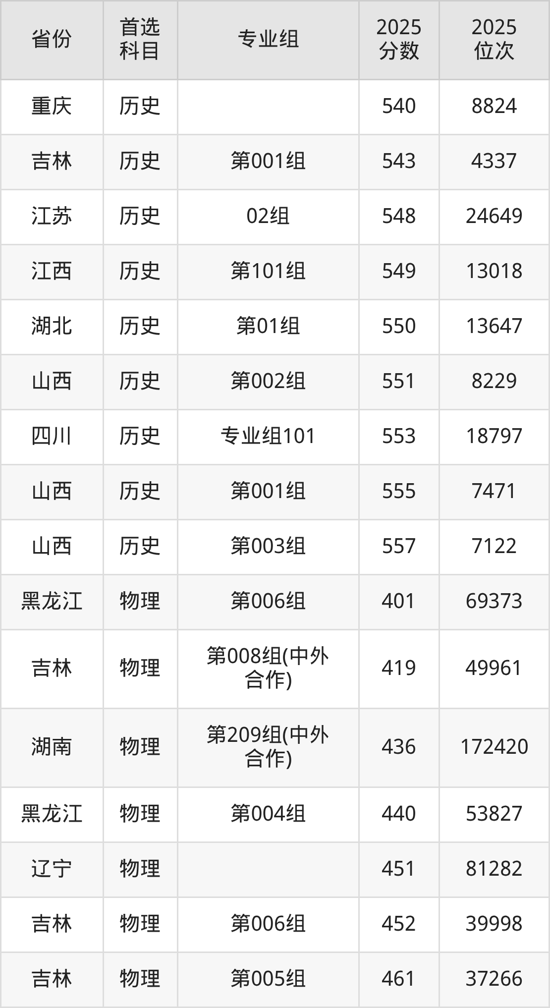 历史类最低分对应地区为吉林(第002组),录取位次为12678,超本科线76分;最高分对应地区为山西(第003组),录取位次为7122,超本科线114分。