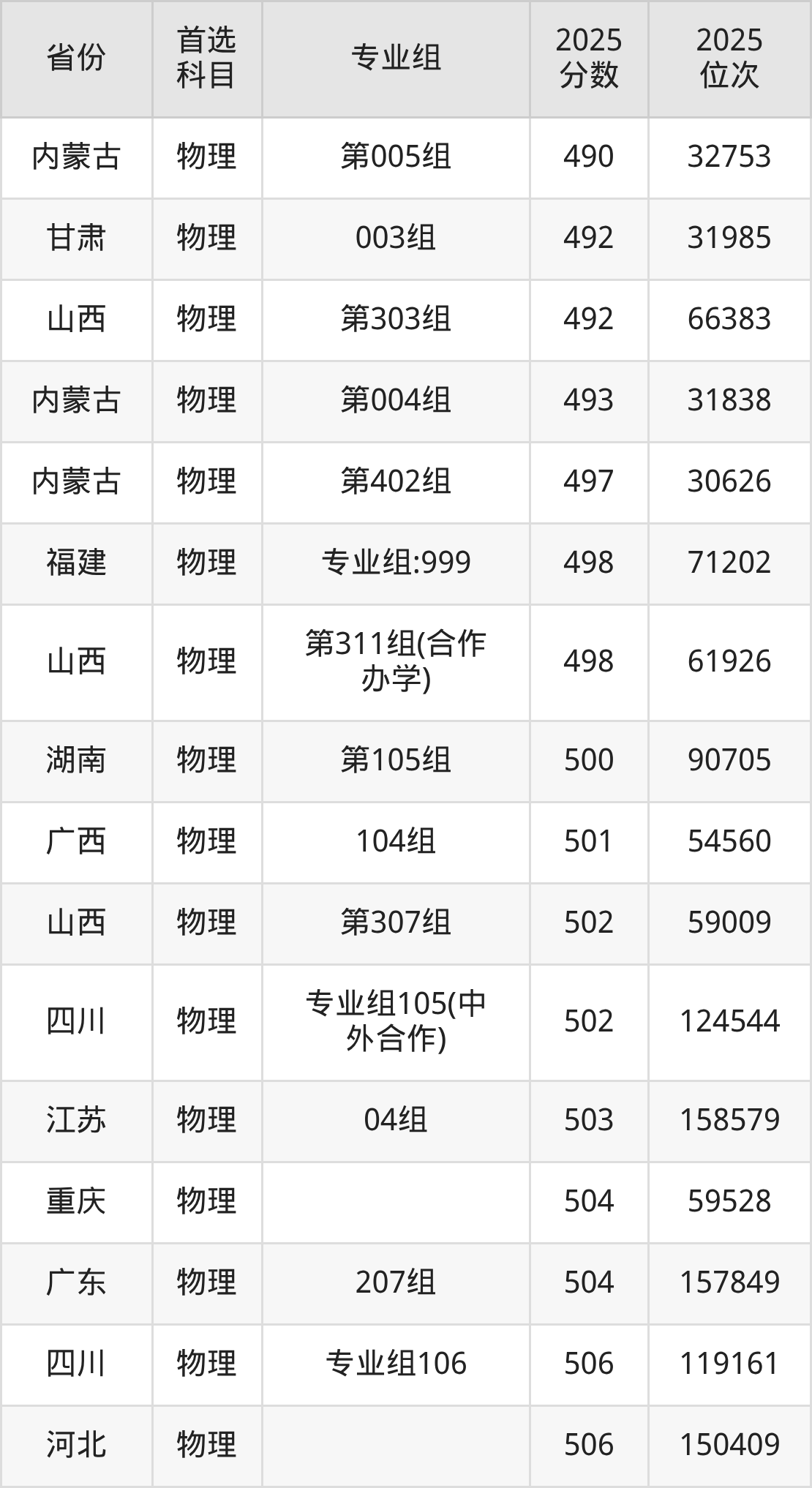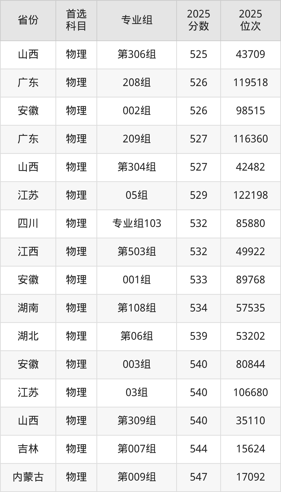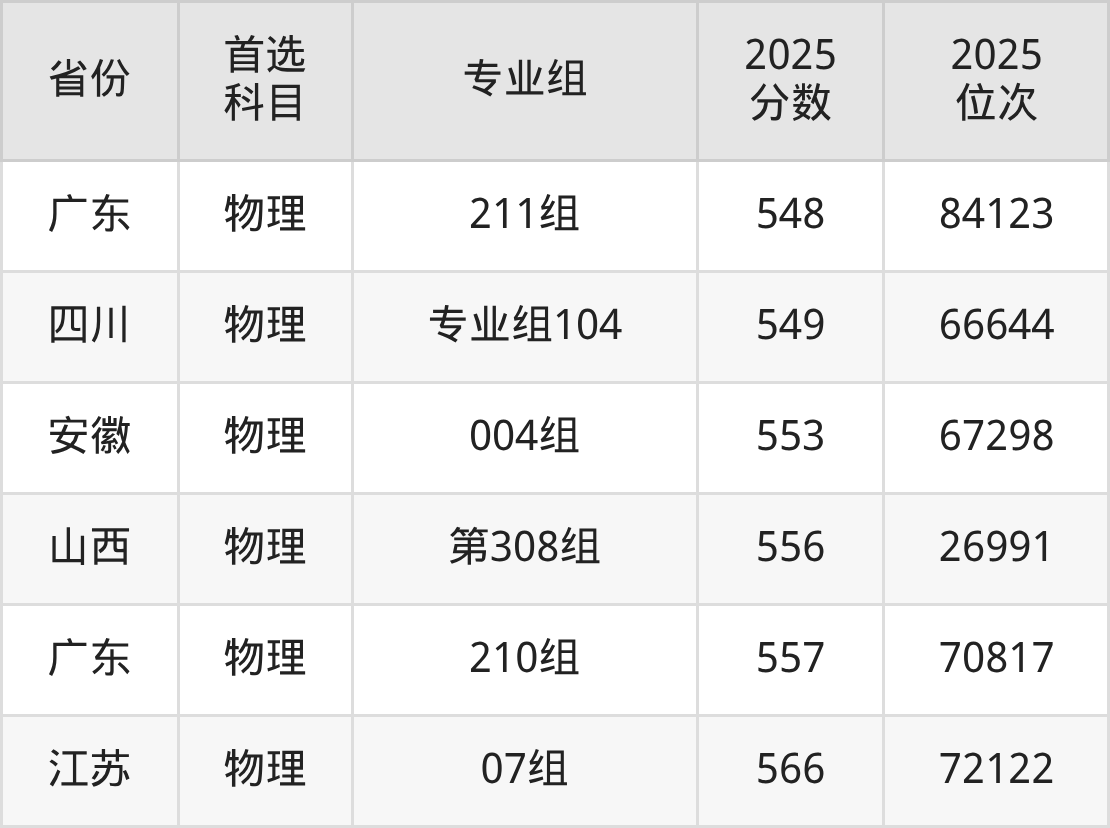 物理类最低分对应地区为黑龙江(第006组),录取位次为69373,超本科线41分;最高分对应地区为江苏(07组),录取位次为72122,超本科线103分。
