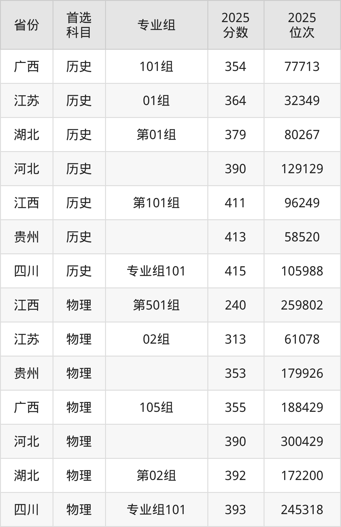 历史类最低分对应地区为广西(101组),录取位次为77713,超专科线154分;最高分对应地区为四川(专业组101),录取位次为105988,超专科线265分。