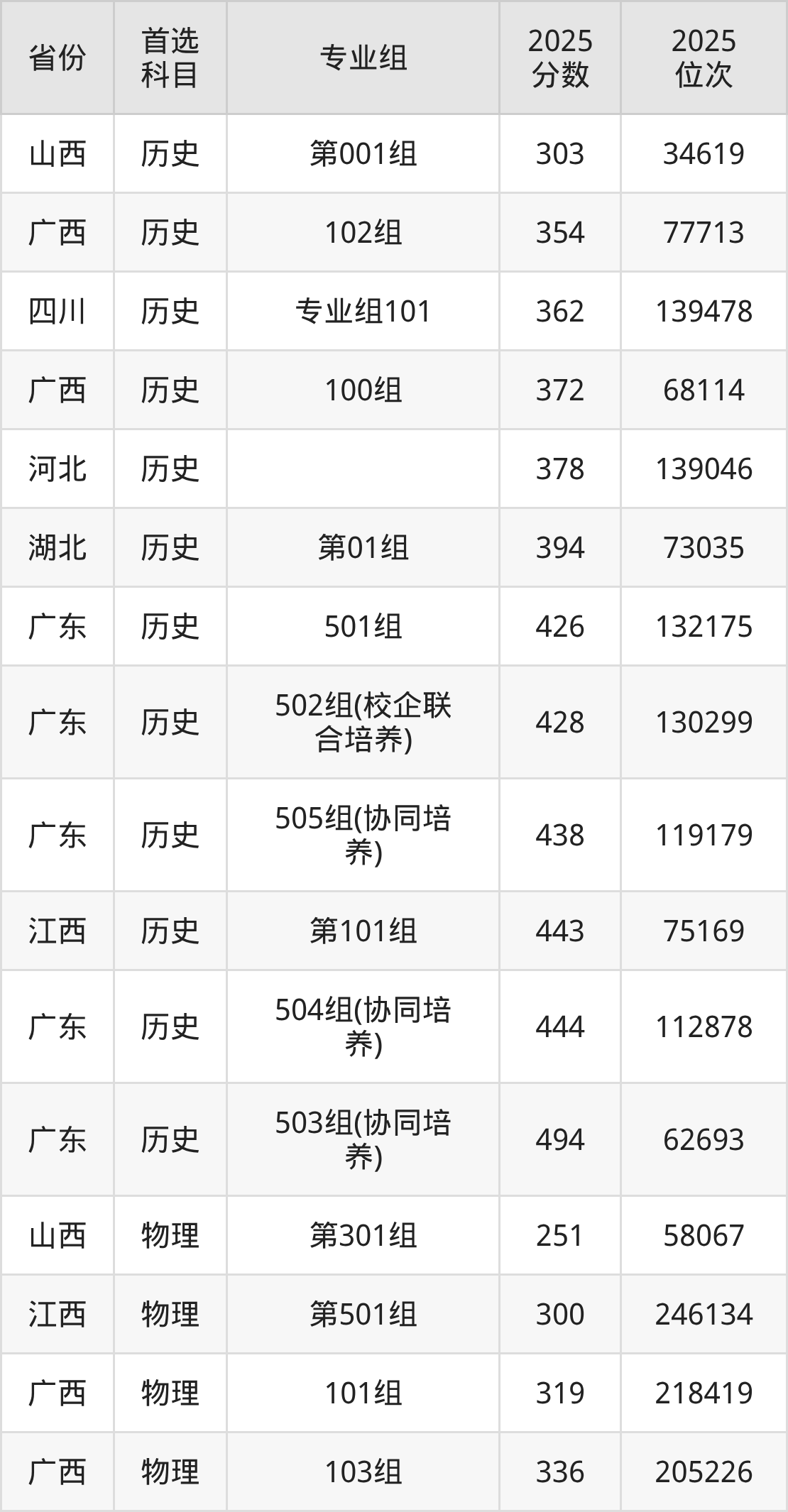 物理类最低分对应地区为山西(第301组),录取位次为58067,超专科线151分;最高分对应地区为广东(508组(协同培养)),录取位次为225004,超专科线267分。