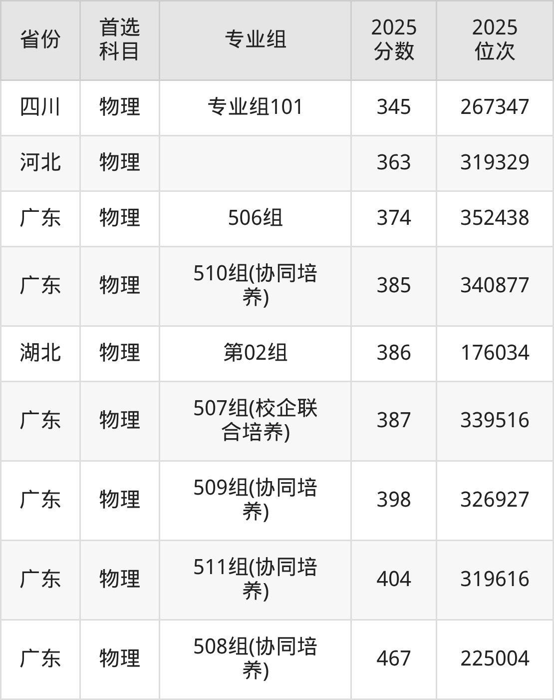 物理类:509组(中外合作)375分、349716名,530组(校企联合培养)388分、334331名,532组(协同培养)419分、291824名,536组376分、349233名;