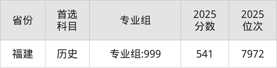 历史类最低分对应地区为福建(专业组:999),录取位次为7972,超本科线91分。