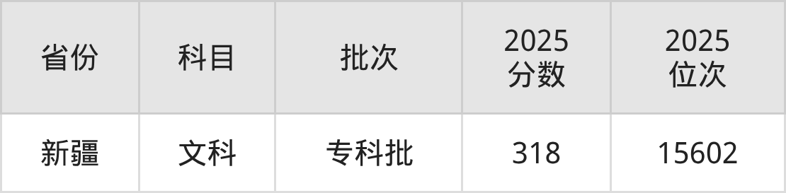 文科最低分对应地区为新疆,录取位次为15602,超专科线178分。