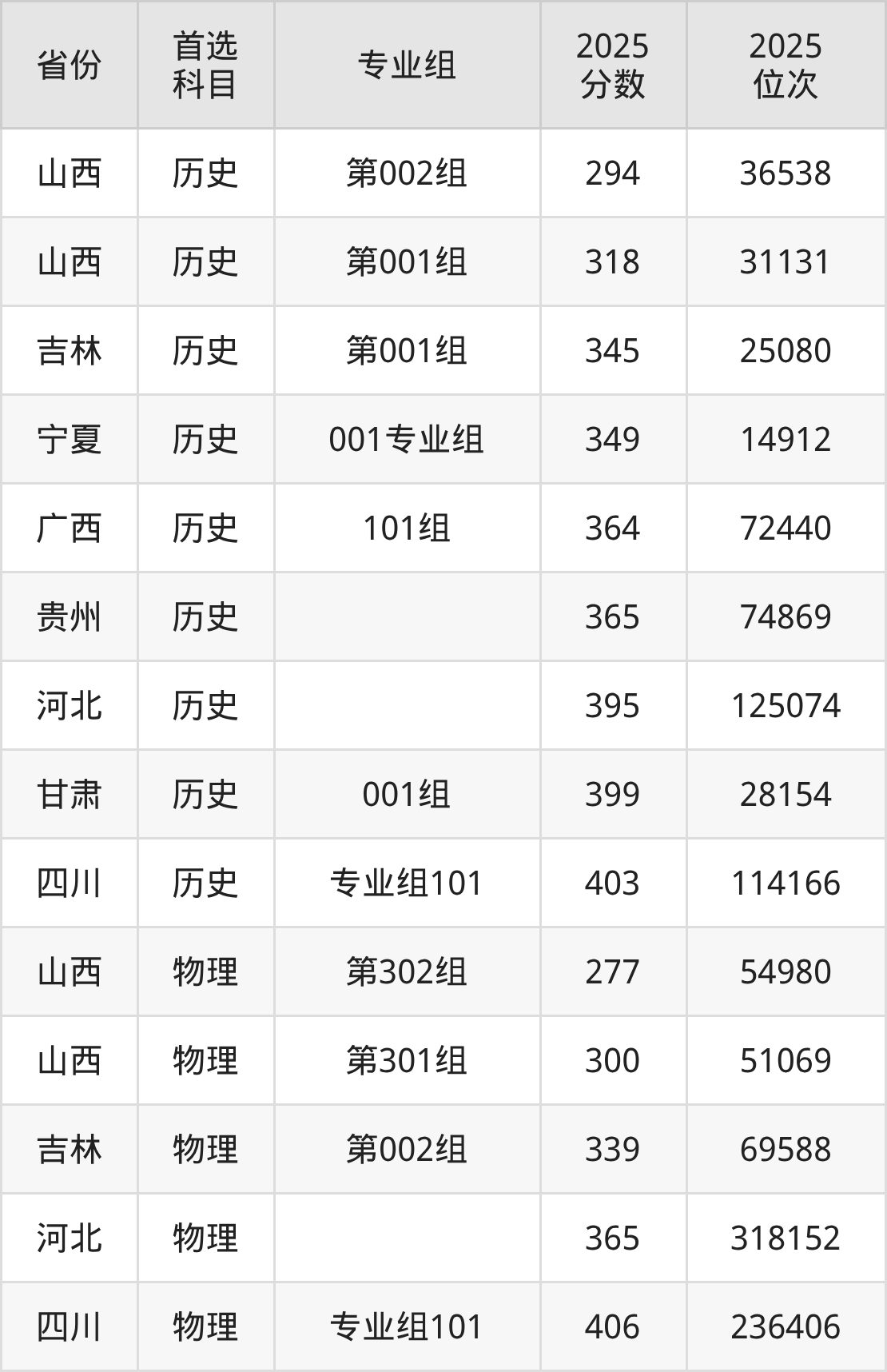 物理类最低分对应地区为山西(第302组),录取位次为54980,超专科线177分;最高分对应地区为四川(专业组101),录取位次为236406,超专科线256分。