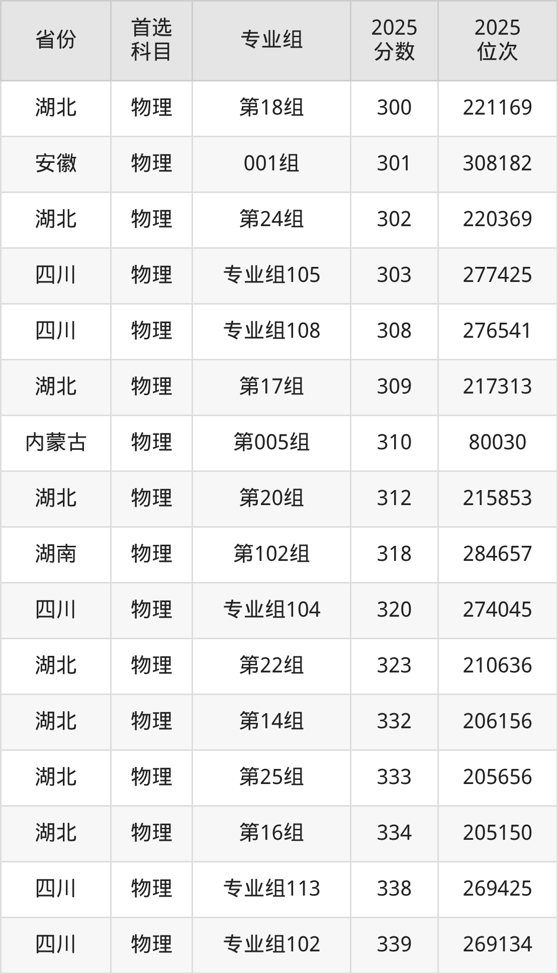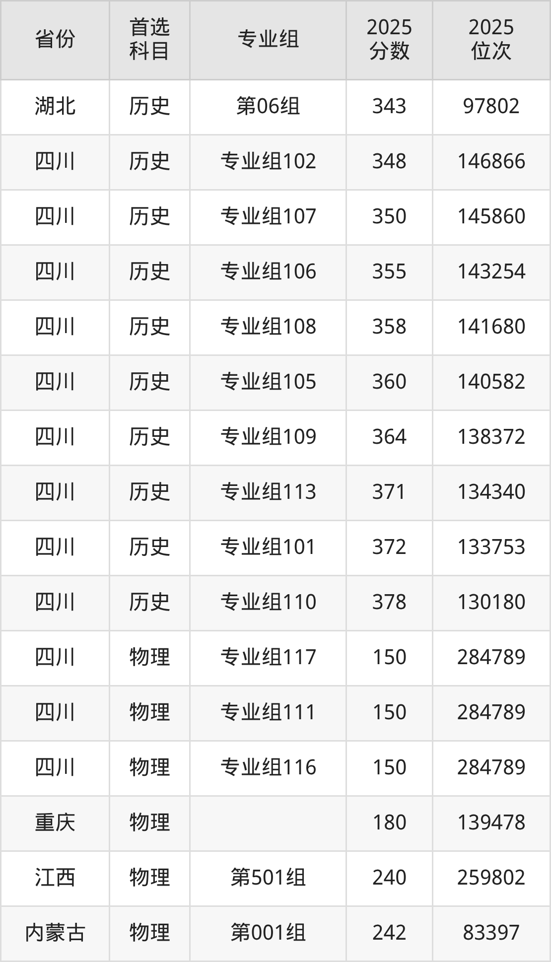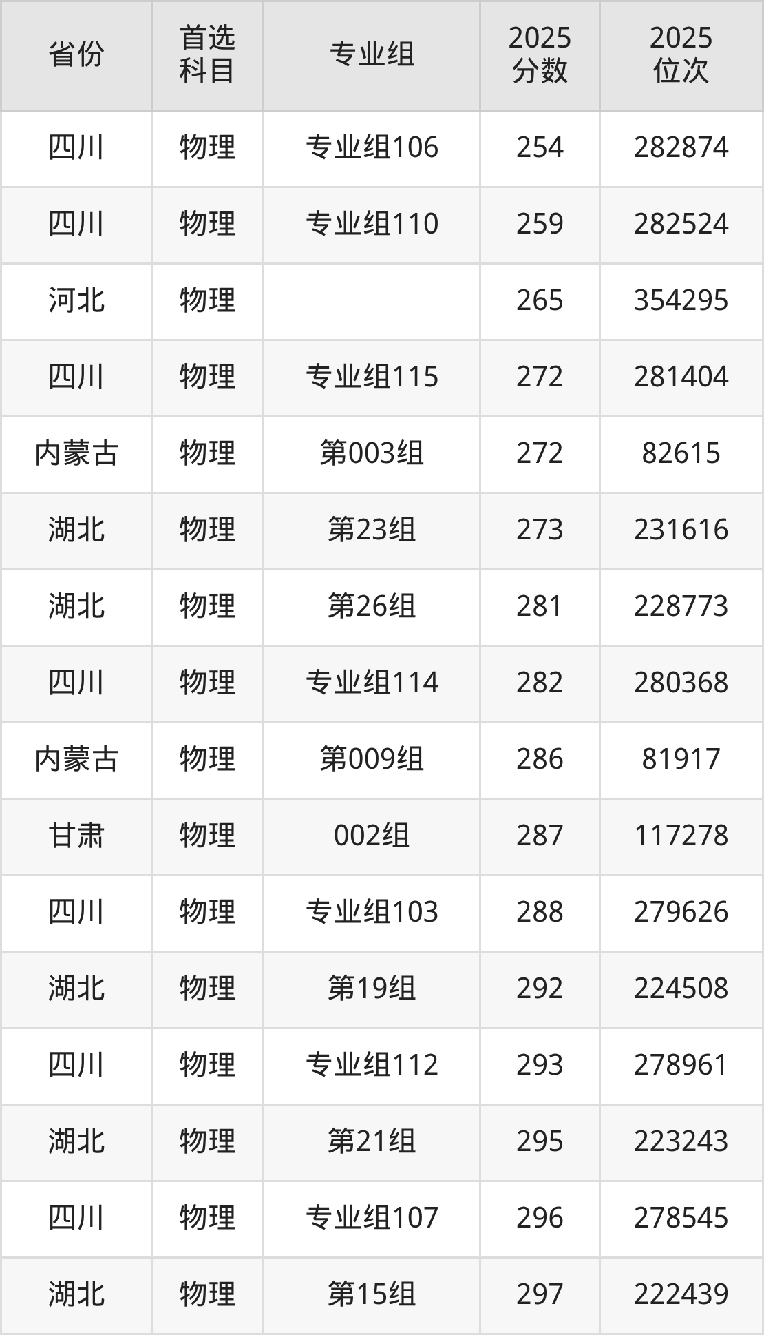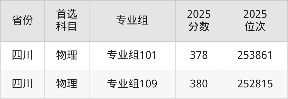 物理类最低分对应地区为四川(专业组117),录取位次为284789;最高分对应地区为四川(专业组109),录取位次为252815。