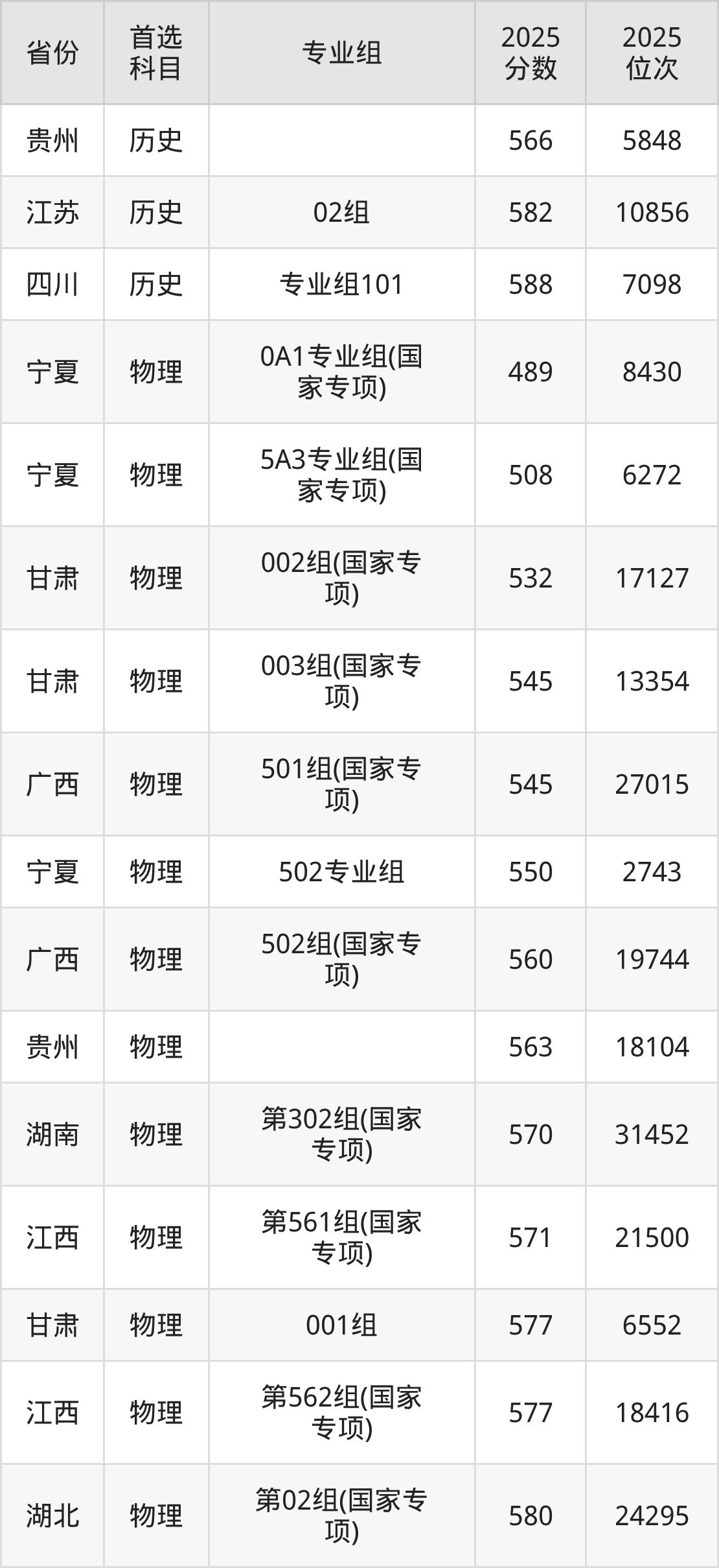 历史类最低分对应地区为贵州,录取位次为5848,超本科线108分;最高分对应地区为四川(专业组101),录取位次为7098,超本科B121分。