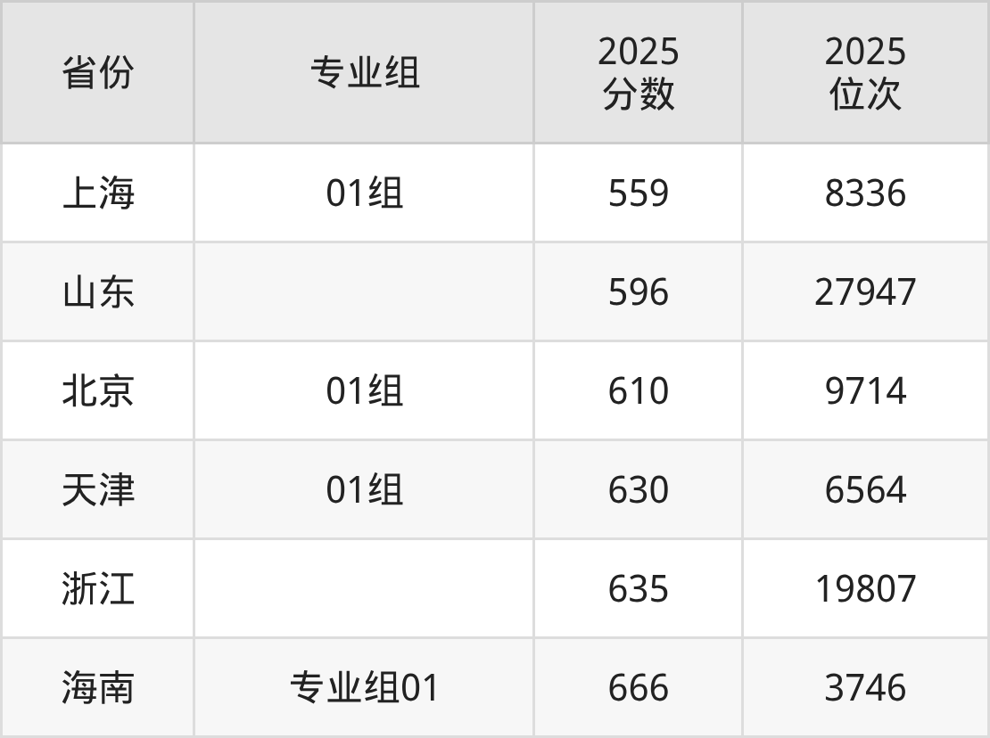 最低分对应地区为上海(01组),录取位次为8336,超本科线157分;最高分对应地区为海南(专业组01),录取位次为3746,超本科线186分。