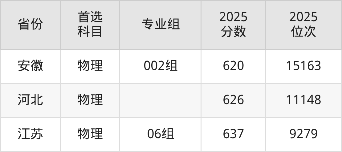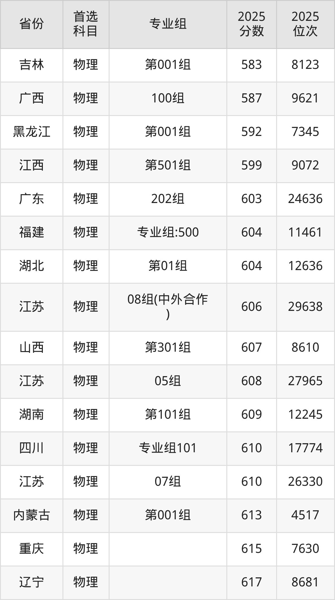 物理类:05组608分、27965名,06组637分、9279名,07组610分、26330名,08组(中外合作)606分、29638名;