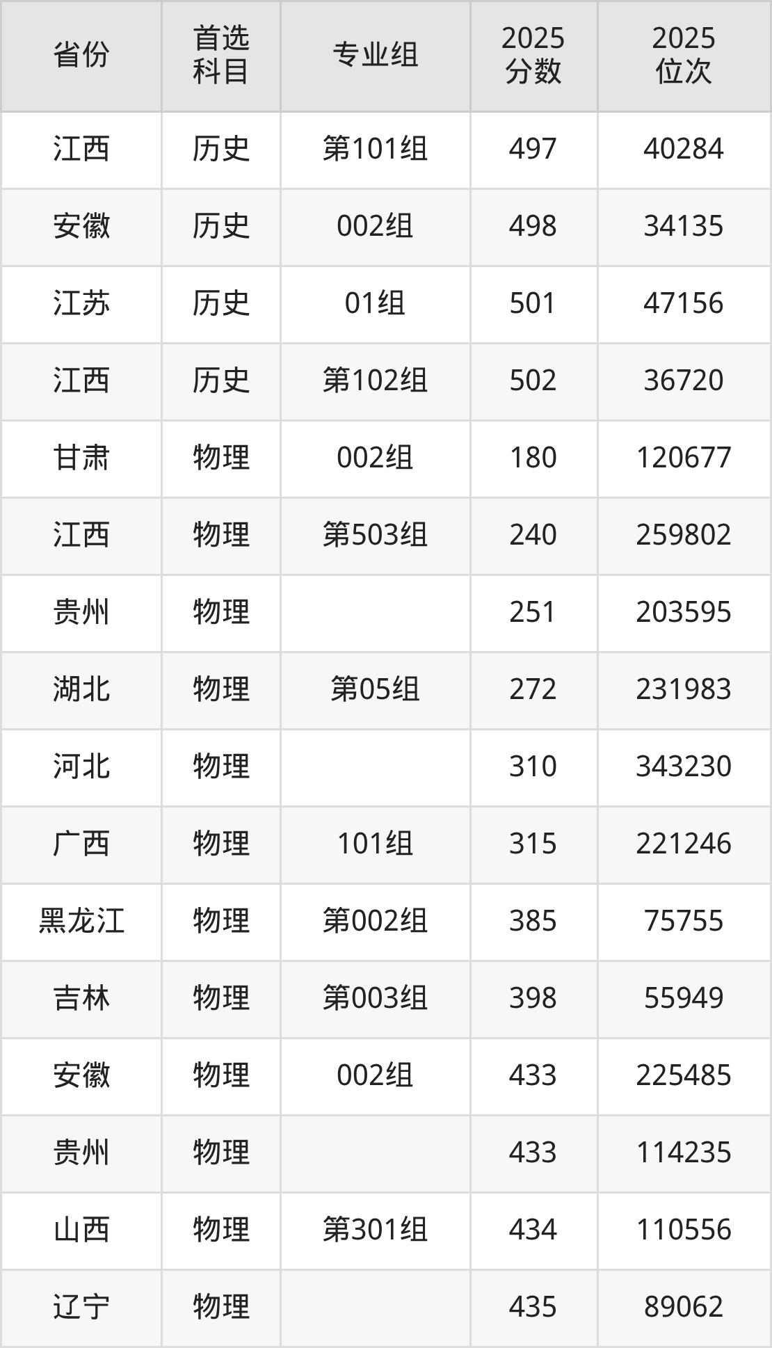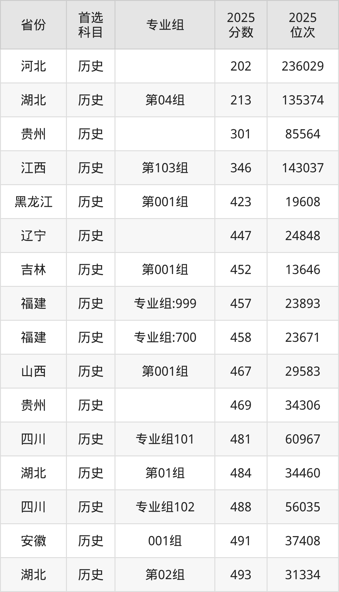 历史类最低分对应地区为河北,录取位次为236029,超专科线2分;最高分对应地区为江西(第102组),录取位次为36720,超本科线16分。