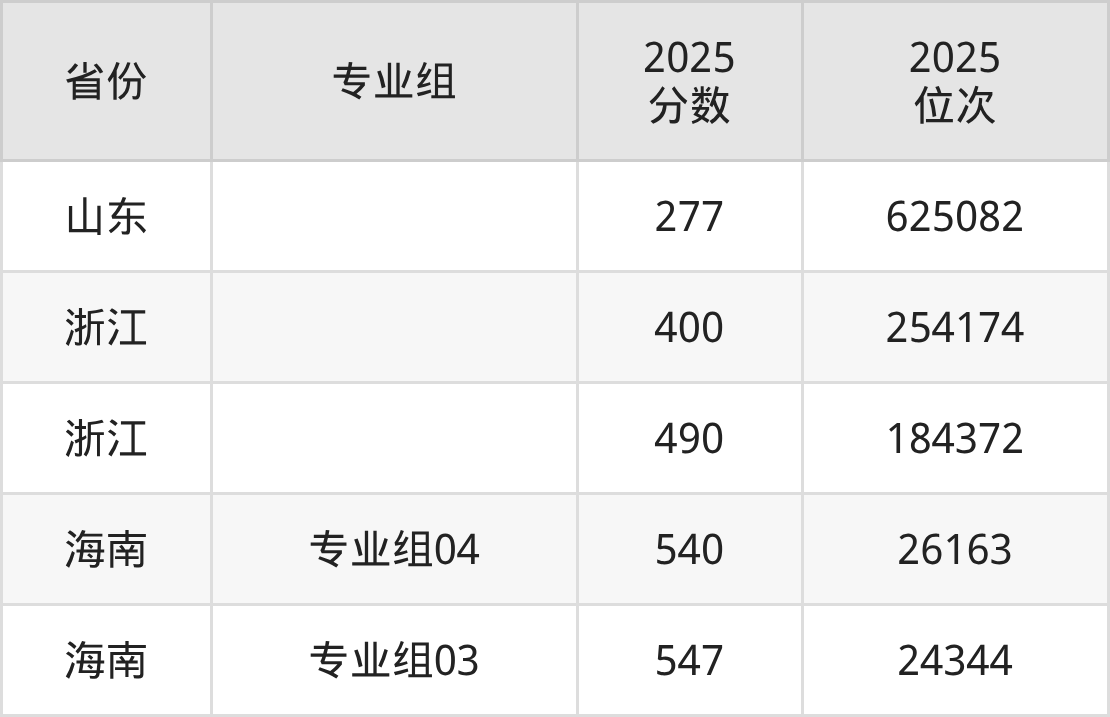 最低分对应地区为山东,录取位次为625082,超二段线127分;最高分对应地区为海南(专业组03),录取位次为24344,超本科线67分。