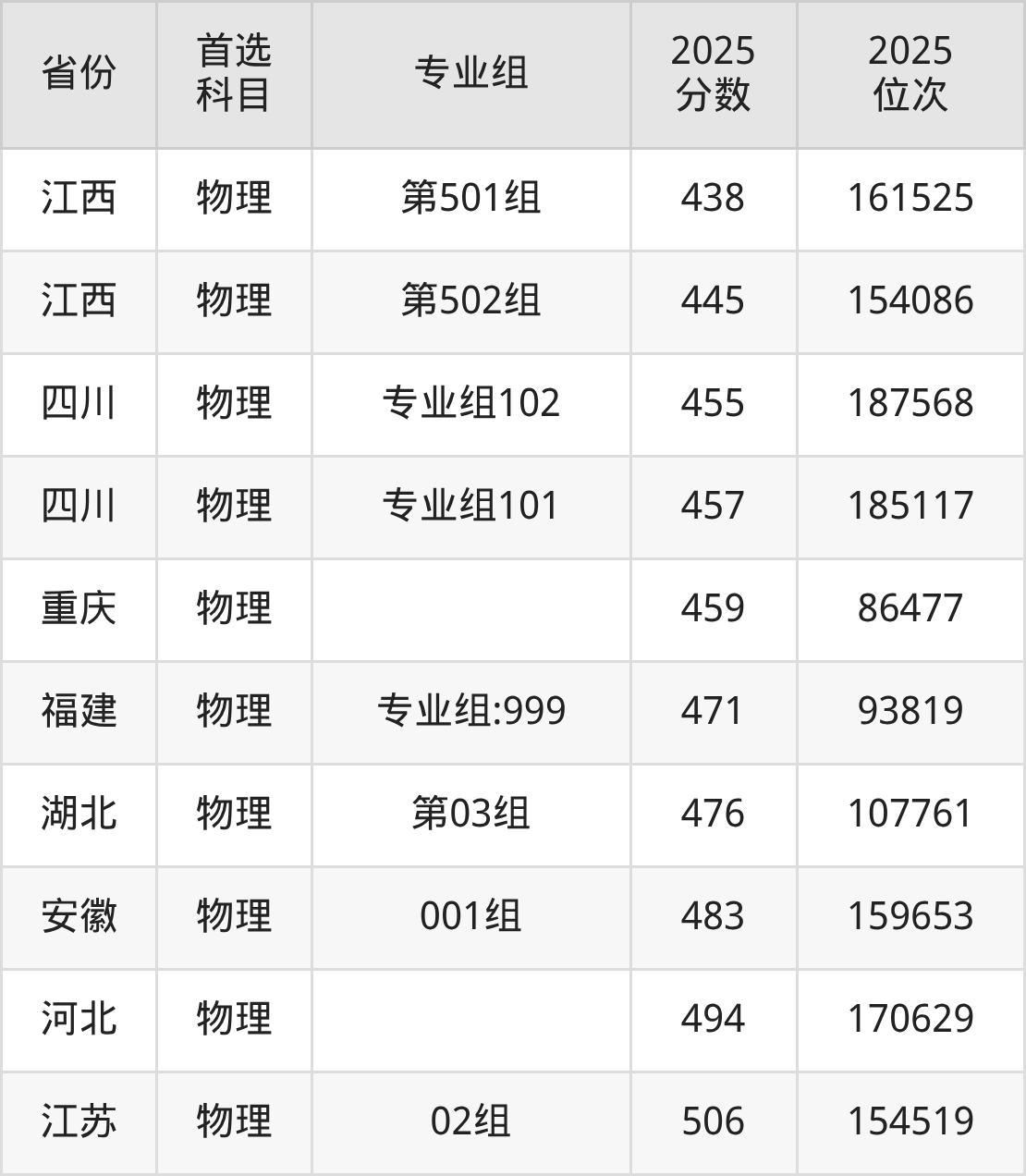 物理类:第501组455分、141516名,第502组458分、138857名,第503组264分、252385名;