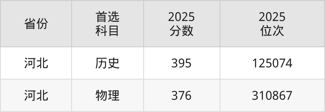 历史类最低分对应地区为河北,录取位次为125074,超专科线195分。
