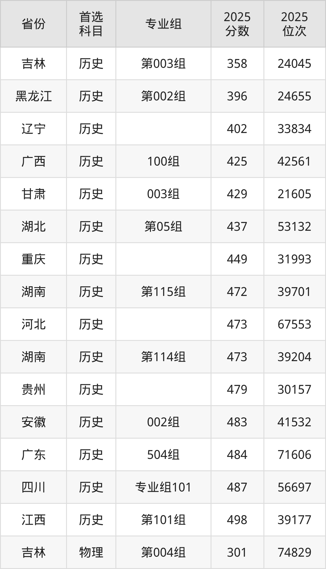 历史类最低分对应地区为吉林(第003组),录取位次为24045,超专科线198分;最高分对应地区为江西(第101组),录取位次为39177,超专科线208分。