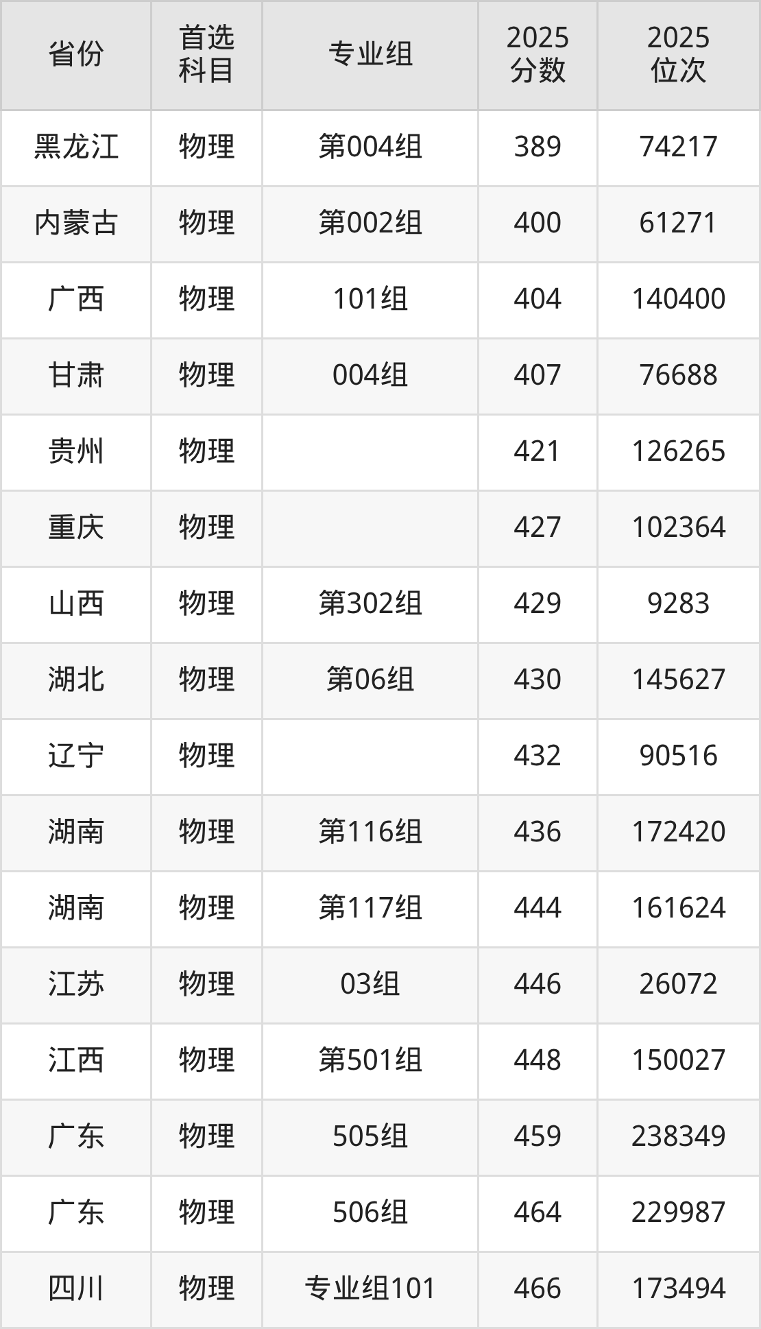 物理类最低分对应地区为吉林(第004组),录取位次为74829,超专科线141分;最高分对应地区为河北,录取位次为202340,超专科线274分。