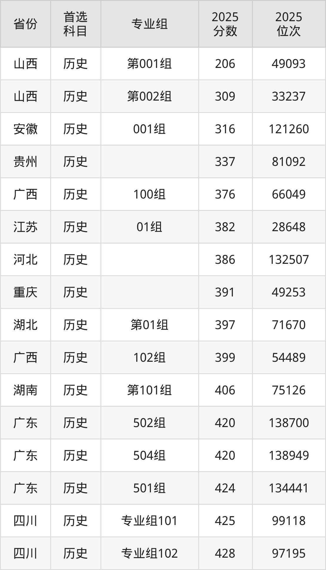 历史类最低分对应地区为山西(第001组),录取位次为49093,超专科线106分;最高分对应地区为广东(523组(协同培养)),录取位次为58196,超专科线285分。