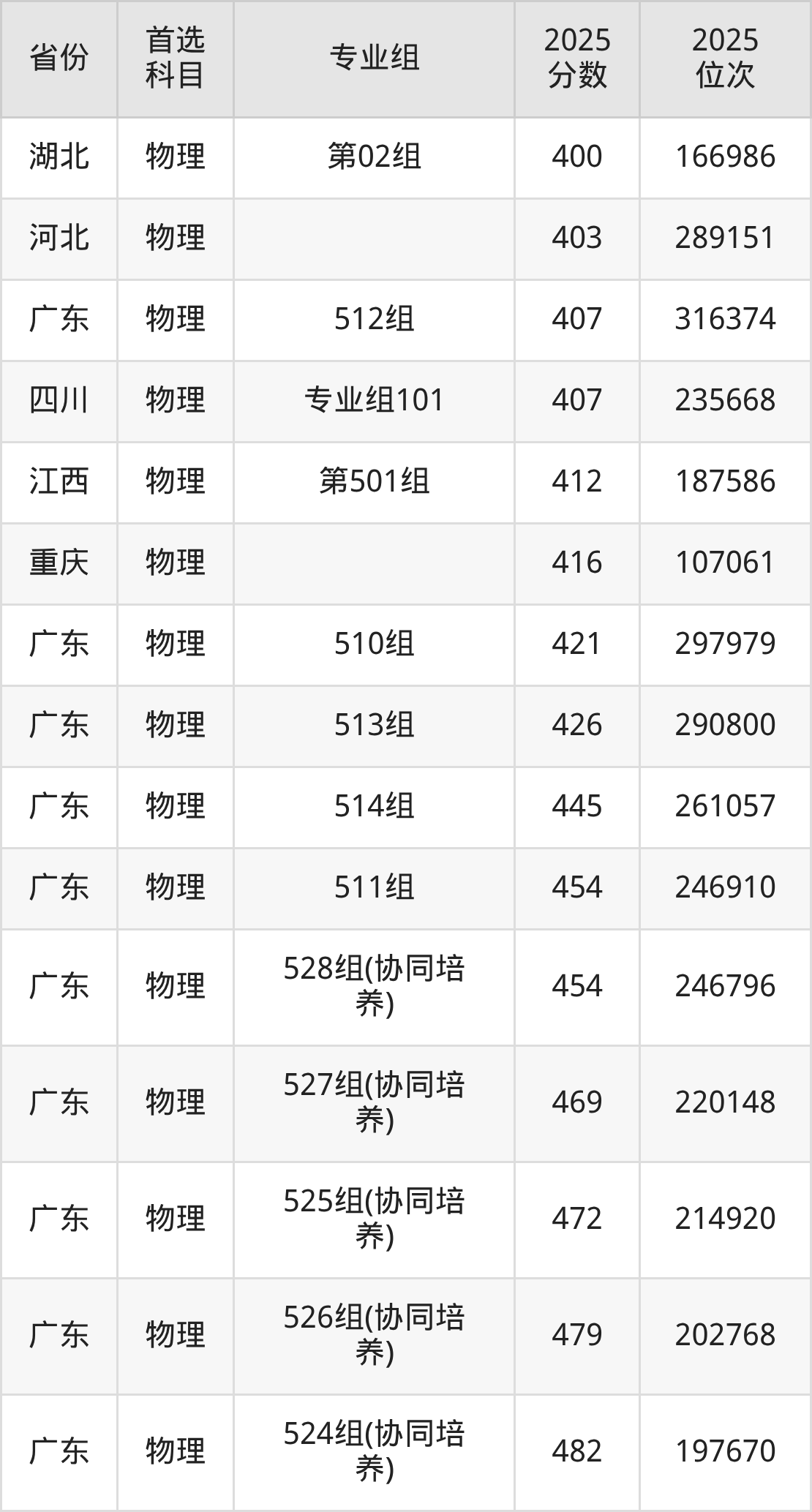 物理类:508组385分、338924名,510组407分、309485名,511组451分、237404名,512组384分、339866名,513组434分、267423名,515组382分、341870名,524组(协同培养)451分、236310名,525组(协同培养)473分、196471名,526组(协同培养)472分、199117名,527组(协同培养)454分、231235名,528组(协同培养)455分、229537名;