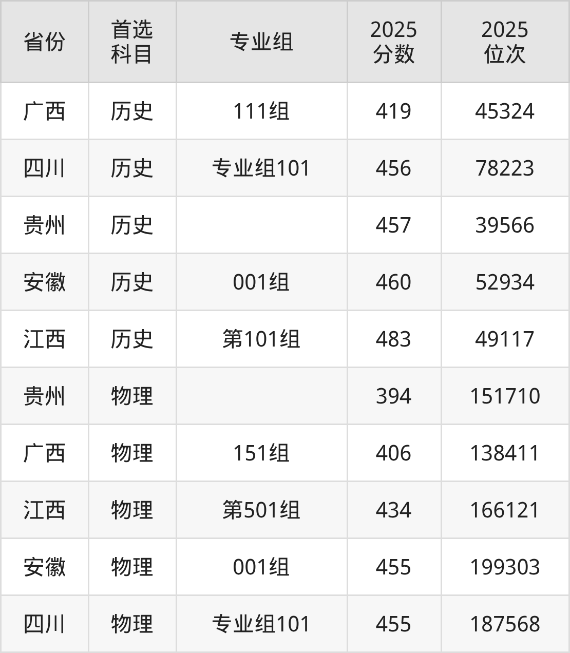 历史类最低分对应地区为广西(111组),录取位次为45324,超专科线219分;最高分对应地区为江西(第101组),录取位次为49117,超专科线193分。