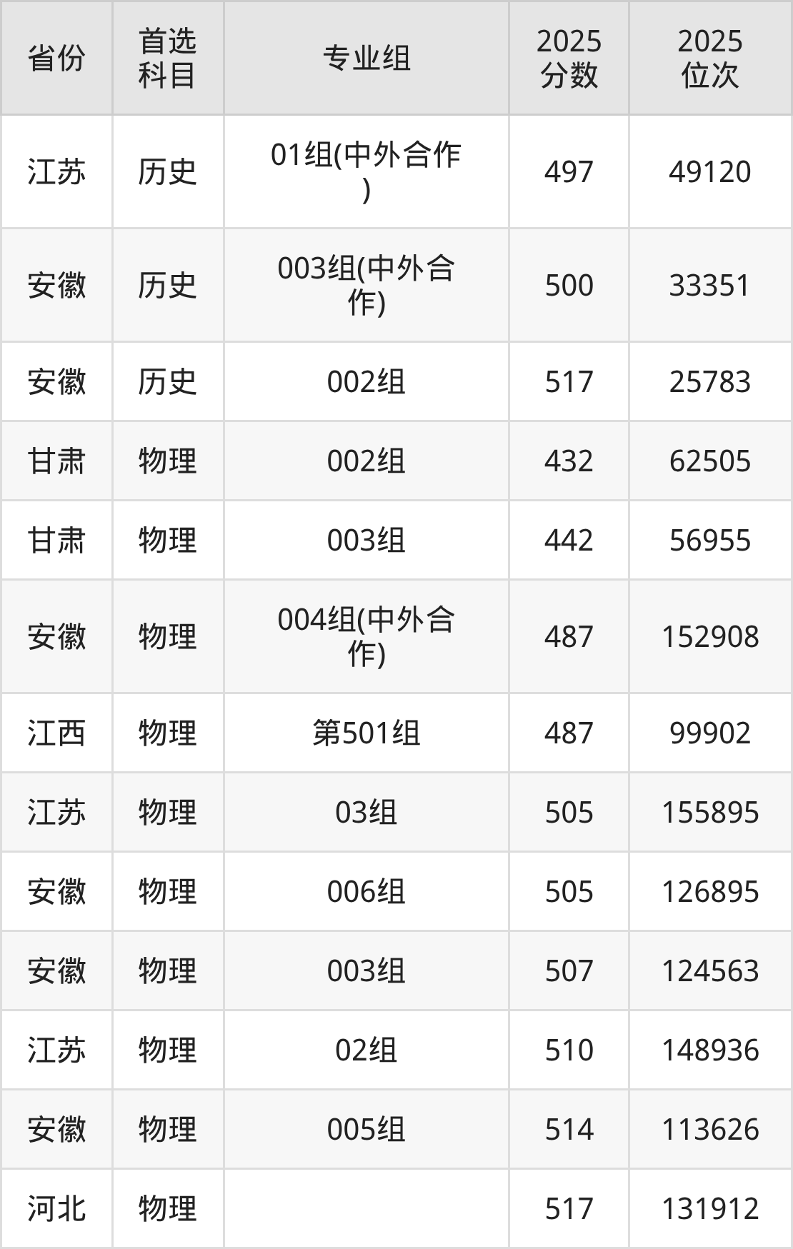 历史类最低分对应地区为江苏(01组(中外合作)),录取位次为49120,超本科线15分;最高分对应地区为安徽(002组),录取位次为25783。