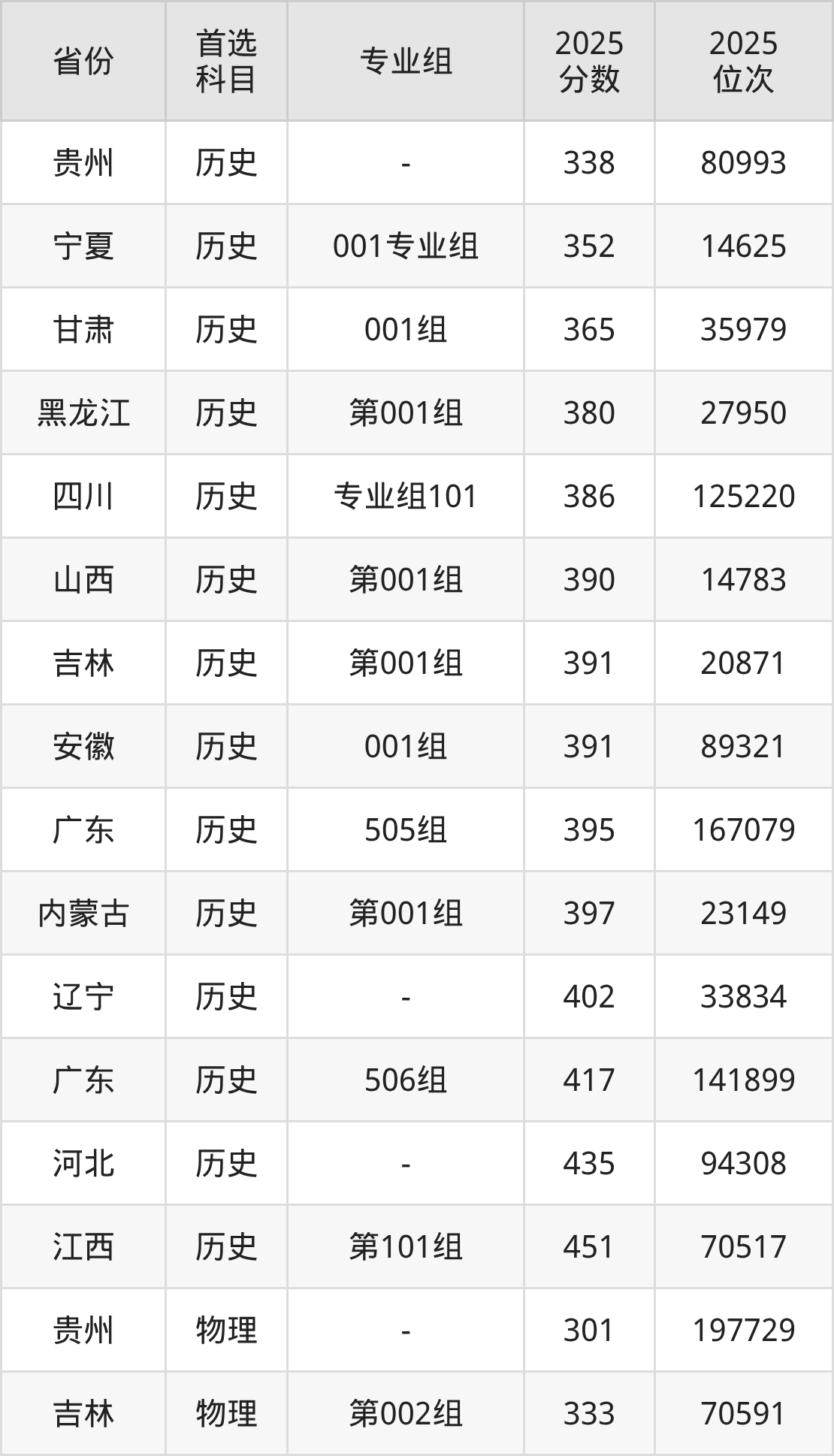 历史类最低分对应地区为贵州,录取位次为80993,超专科线158分;最高分对应地区为江西(第101组),录取位次为70517,超专科线161分。