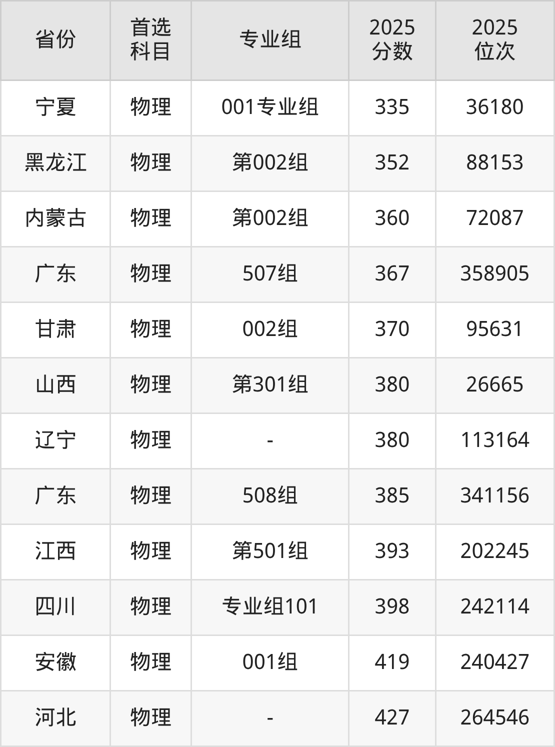 物理类最低分对应地区为贵州,录取位次为197729,超专科线121分;最高分对应地区为河北,录取位次为264546,超专科线227分。