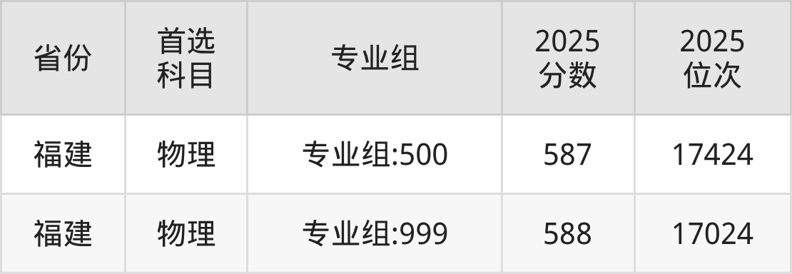 物理类最低分对应地区为福建(专业组:500),录取位次为17424,超本科线146分;最高分对应地区为福建(专业组:999),录取位次为17024,超本科线147分。