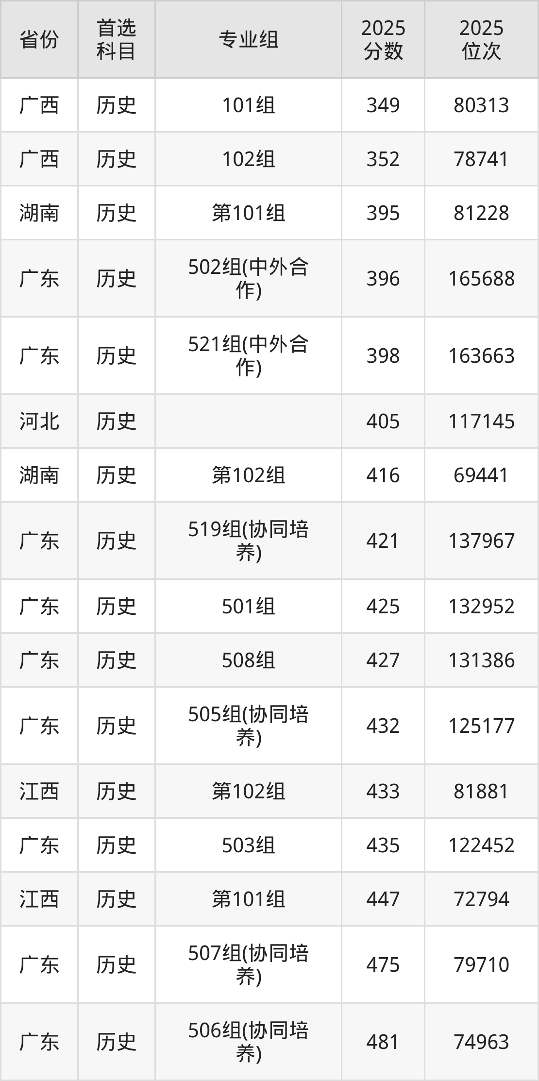 历史类最低分对应地区为广西(101组),录取位次为80313,超专科线149分;最高分对应地区为广东(504组(协同培养)),录取位次为71169。