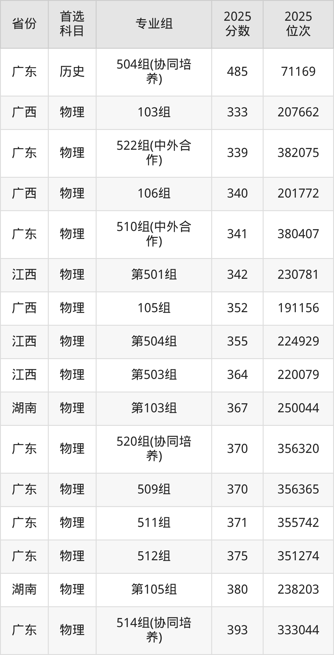 物理类:505组370分、324578名,506组402分、288130名,507组377分、317405名,508组354分、339664名,517组(协同培养)451分、217734名,518组(协同培养)440分、234625名,519组(协同培养)428分、252515名,521组(协同培养)429分、251035名,522组(中外合作)360分、334237名。