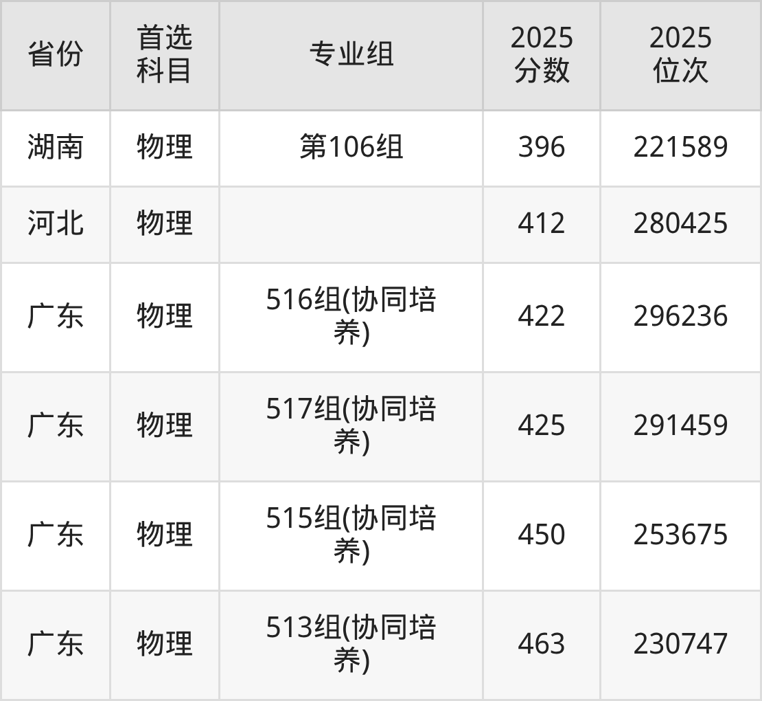 物理类最低分对应地区为广西(103组),录取位次为207662,超专科线133分;最高分对应地区为广东(513组(协同培养)),录取位次为230747,超专科线263分。