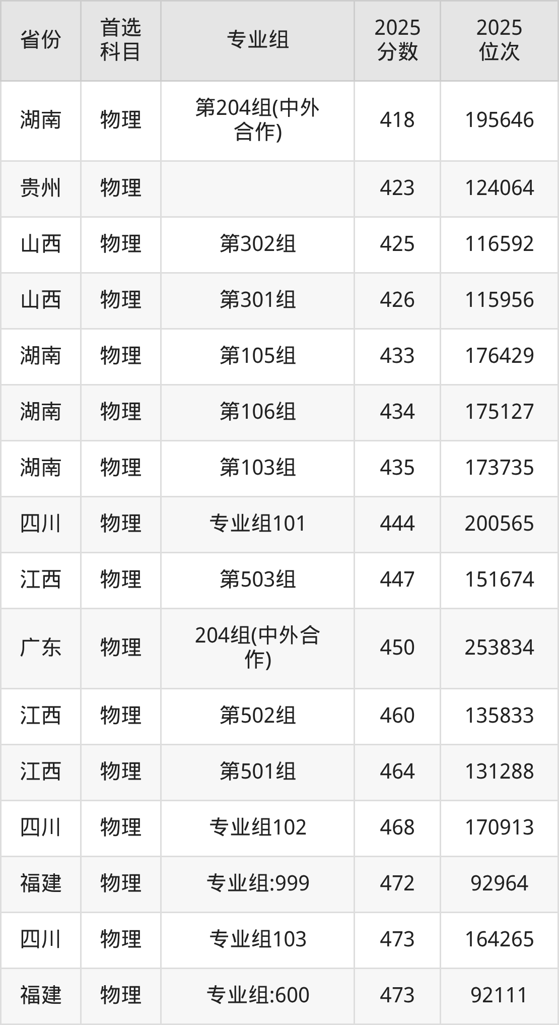 物理类最低分对应地区为广西(151组),录取位次为171534,超本科线3分;最高分对应地区为安徽(004组),录取位次为163454,超本科线19分。