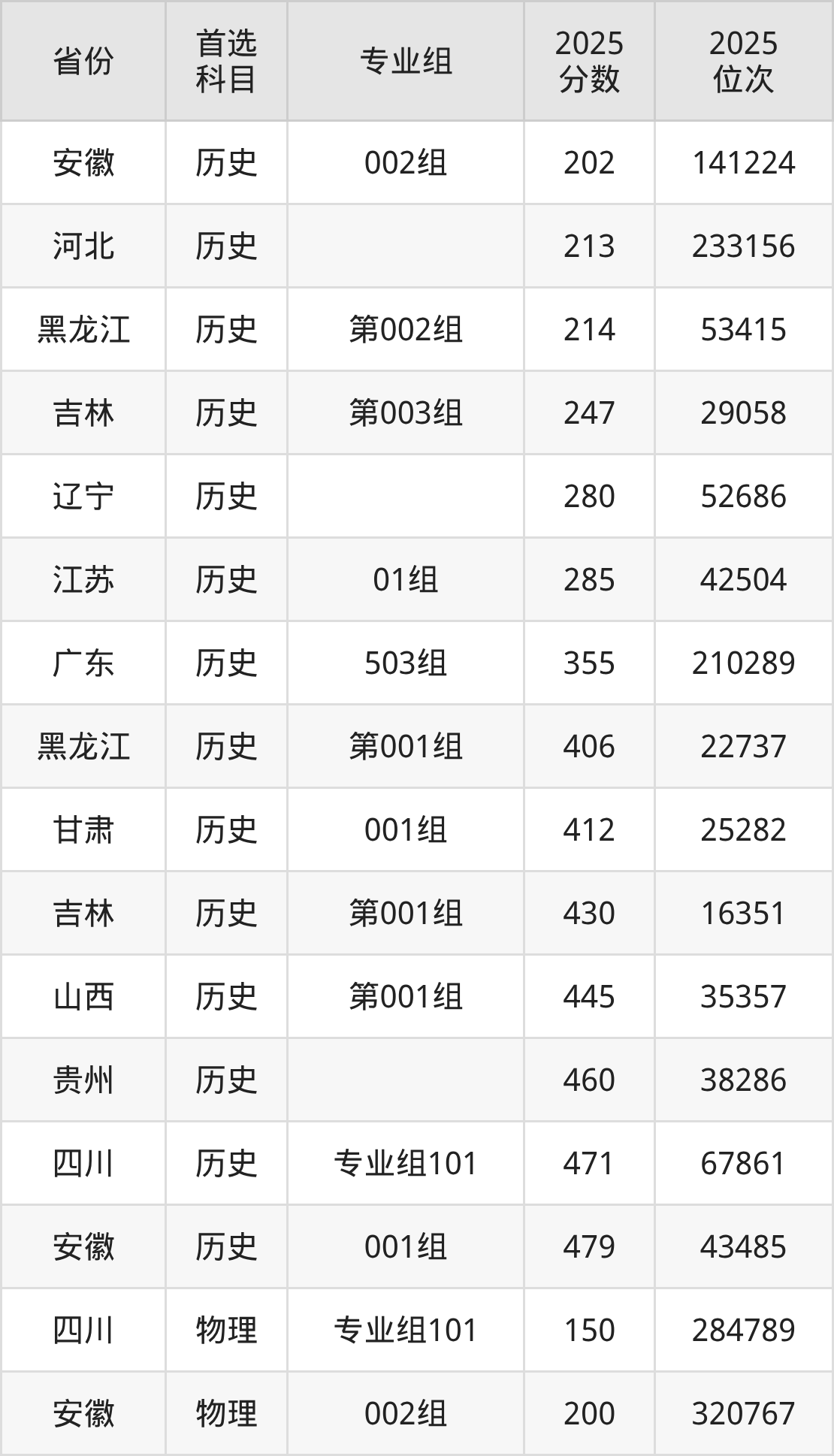 历史类最低分对应地区为安徽(002组),录取位次为141224,超专科线2分;最高分对应地区为安徽(001组),录取位次为43485,超本科线2分。