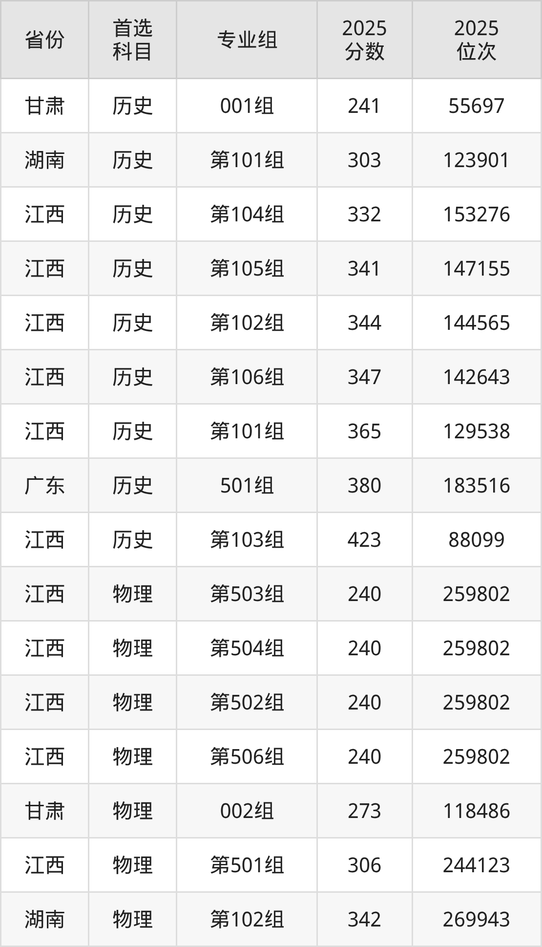 历史类最低分对应地区为甘肃(001组),录取位次为55697,超专科线81分;最高分对应地区为江西(第103组),录取位次为88099,超专科线133分。