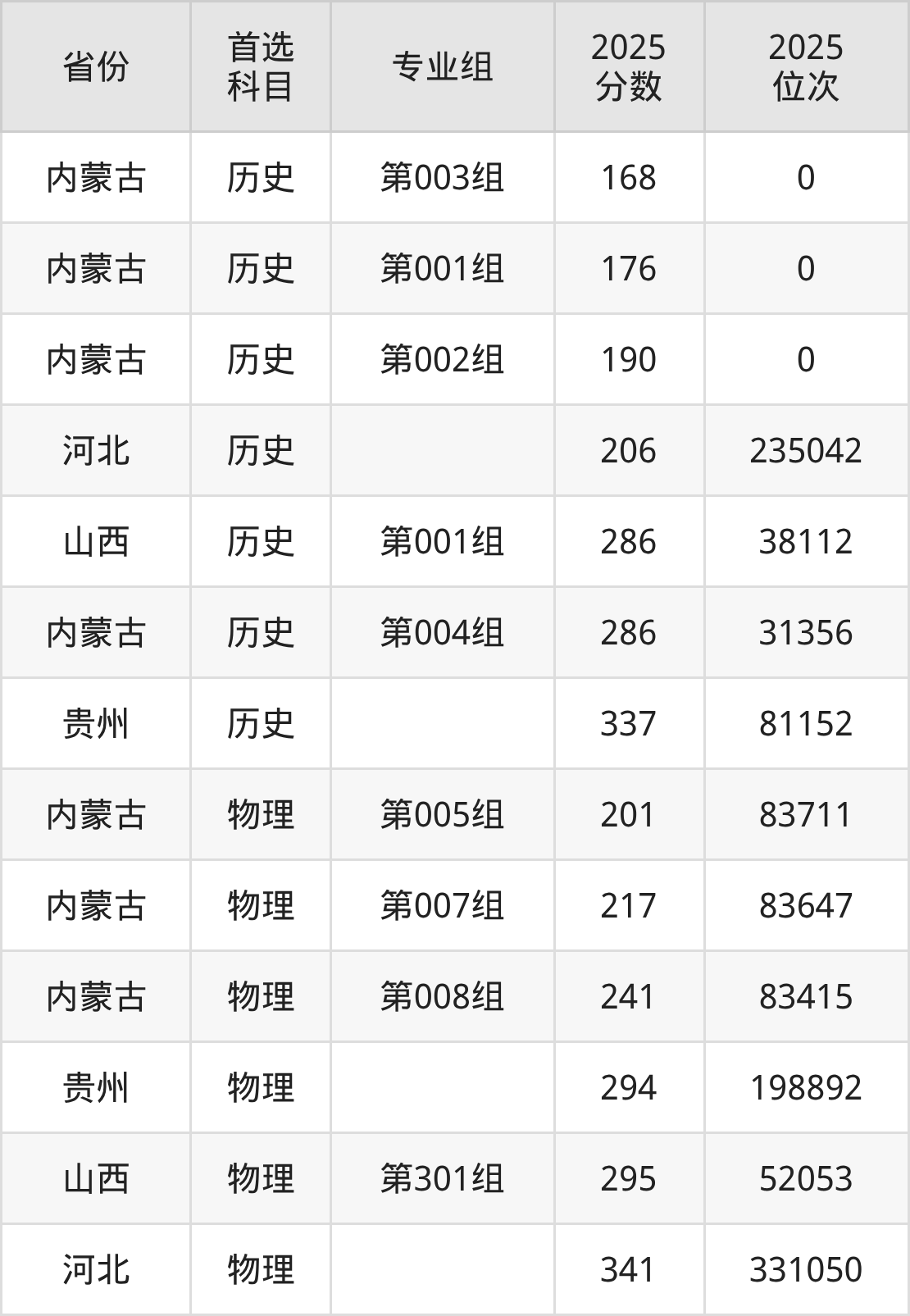历史类最低分对应地区为内蒙古(第003组),超专科线8分;最高分对应地区为贵州,录取位次为81152,超专科线157分。