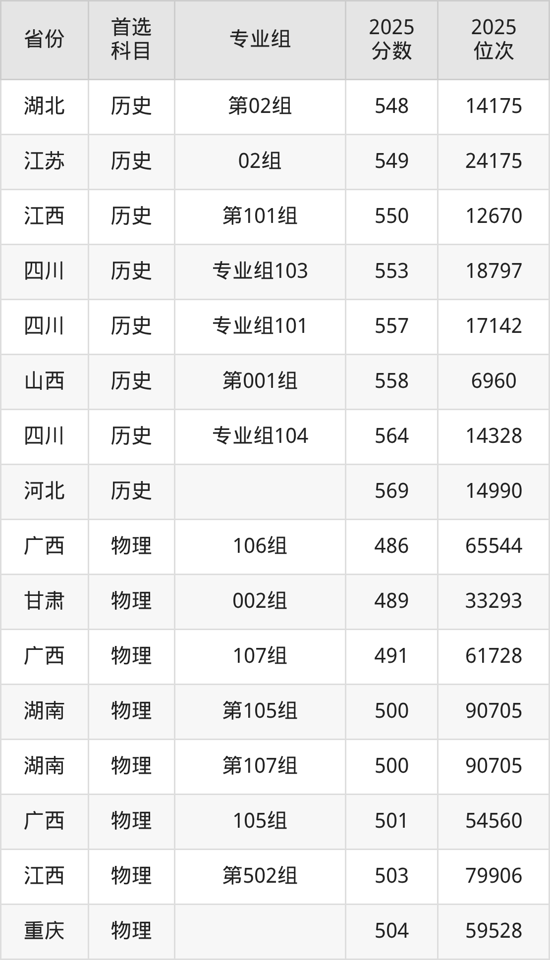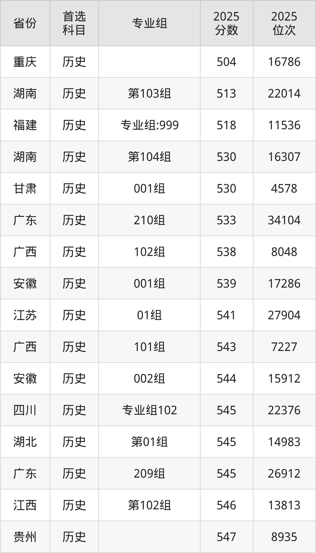 历史类:专业组101557分、17142名,专业组102545分、22376名,专业组103553分、18797名,专业组104564分、14328名;