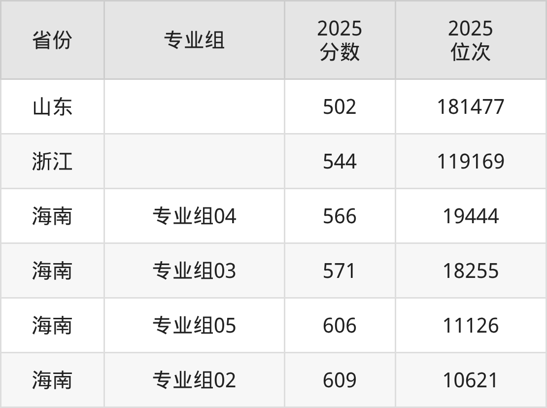 最低分对应地区为山东,录取位次为181477,超一段线85分;最高分对应地区为海南(专业组02),录取位次为10621,超本科线129分。