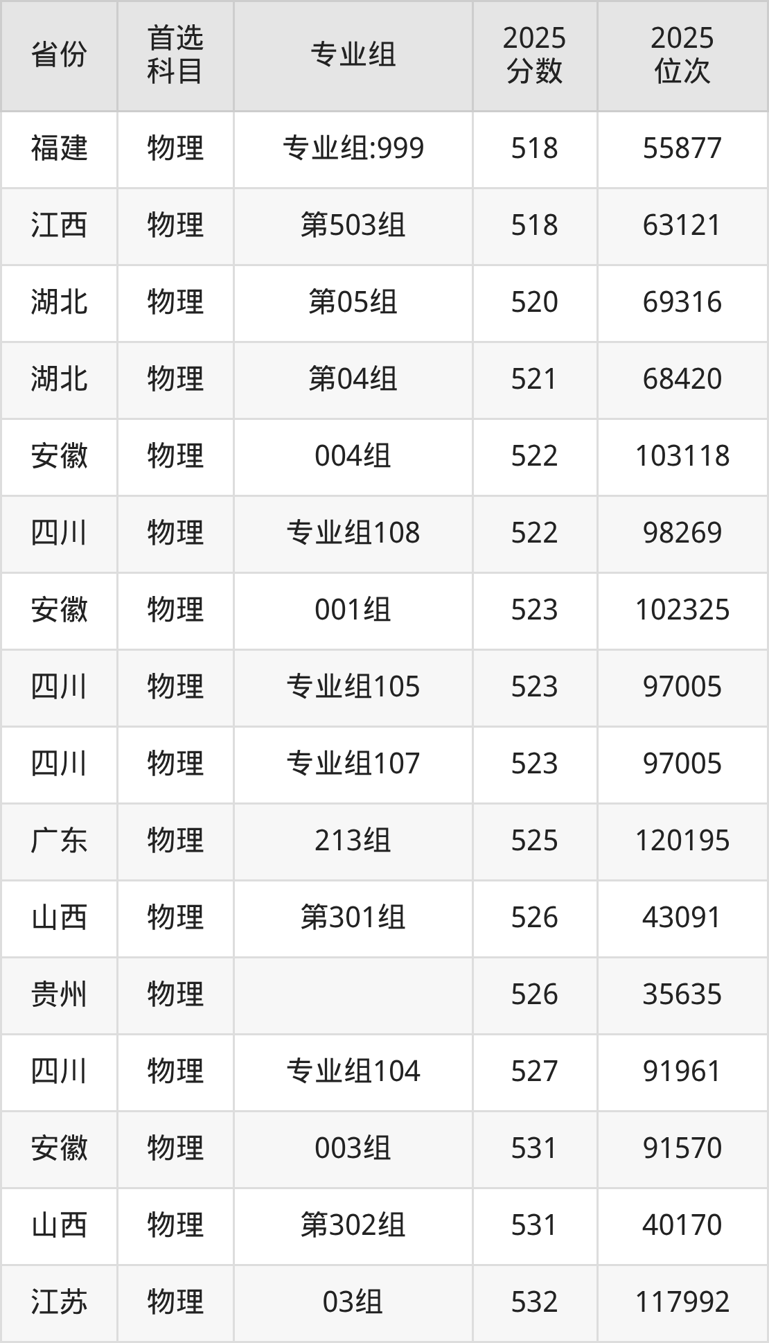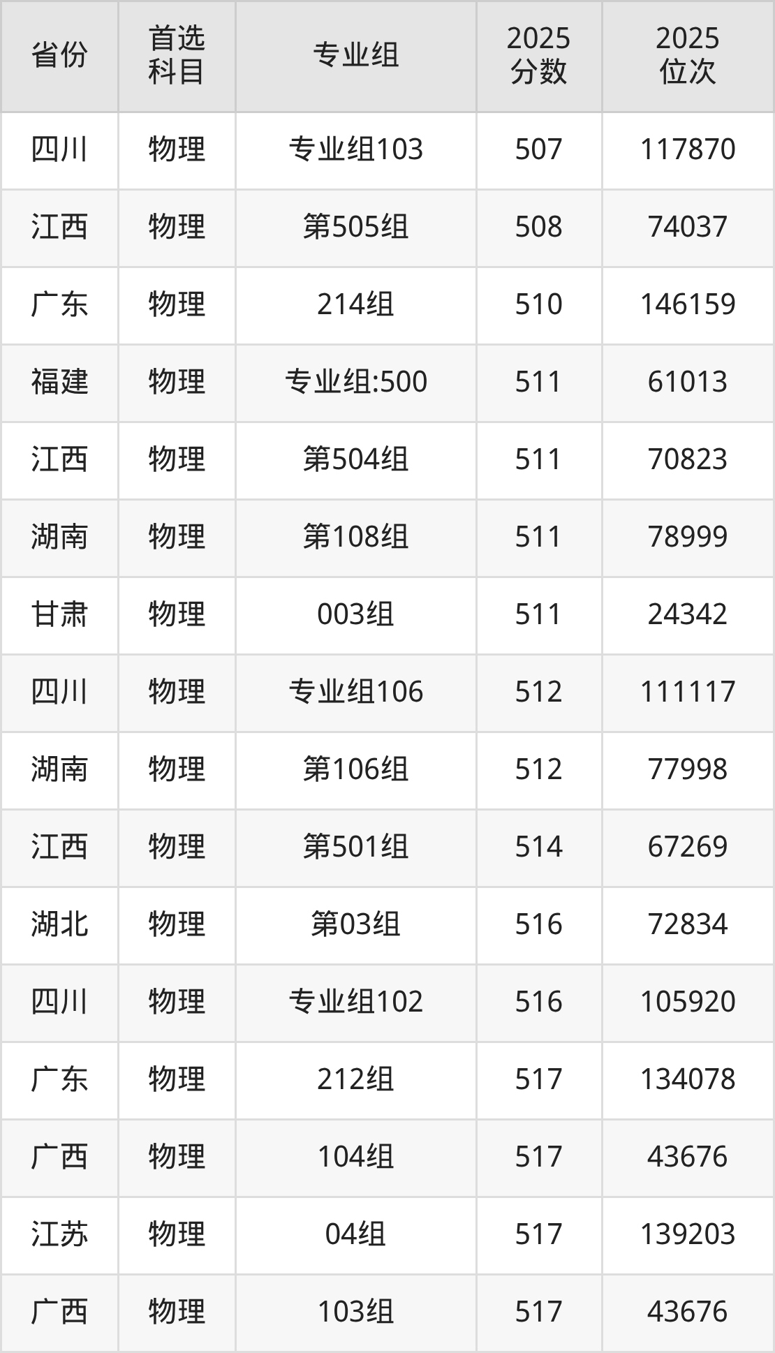 物理类:专业组101544分、71973名,专业组102516分、105920名,专业组103507分、117870名,专业组104527分、91961名,专业组105523分、97005名,专业组106512分、111117名,专业组107523分、97005名,专业组108522分、98269名;