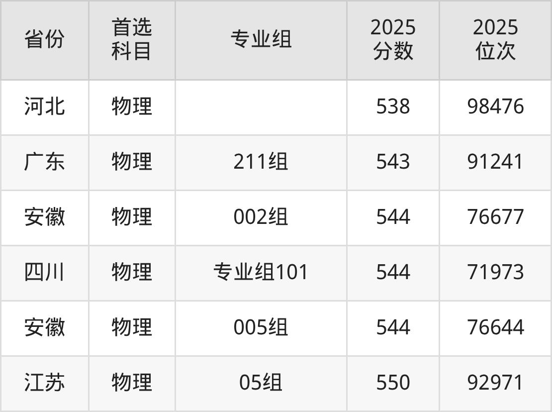 物理类最低分对应地区为广西(106组),录取位次为65544,超本科线116分;最高分对应地区为江苏(05组),录取位次为92971,超本科线87分。
