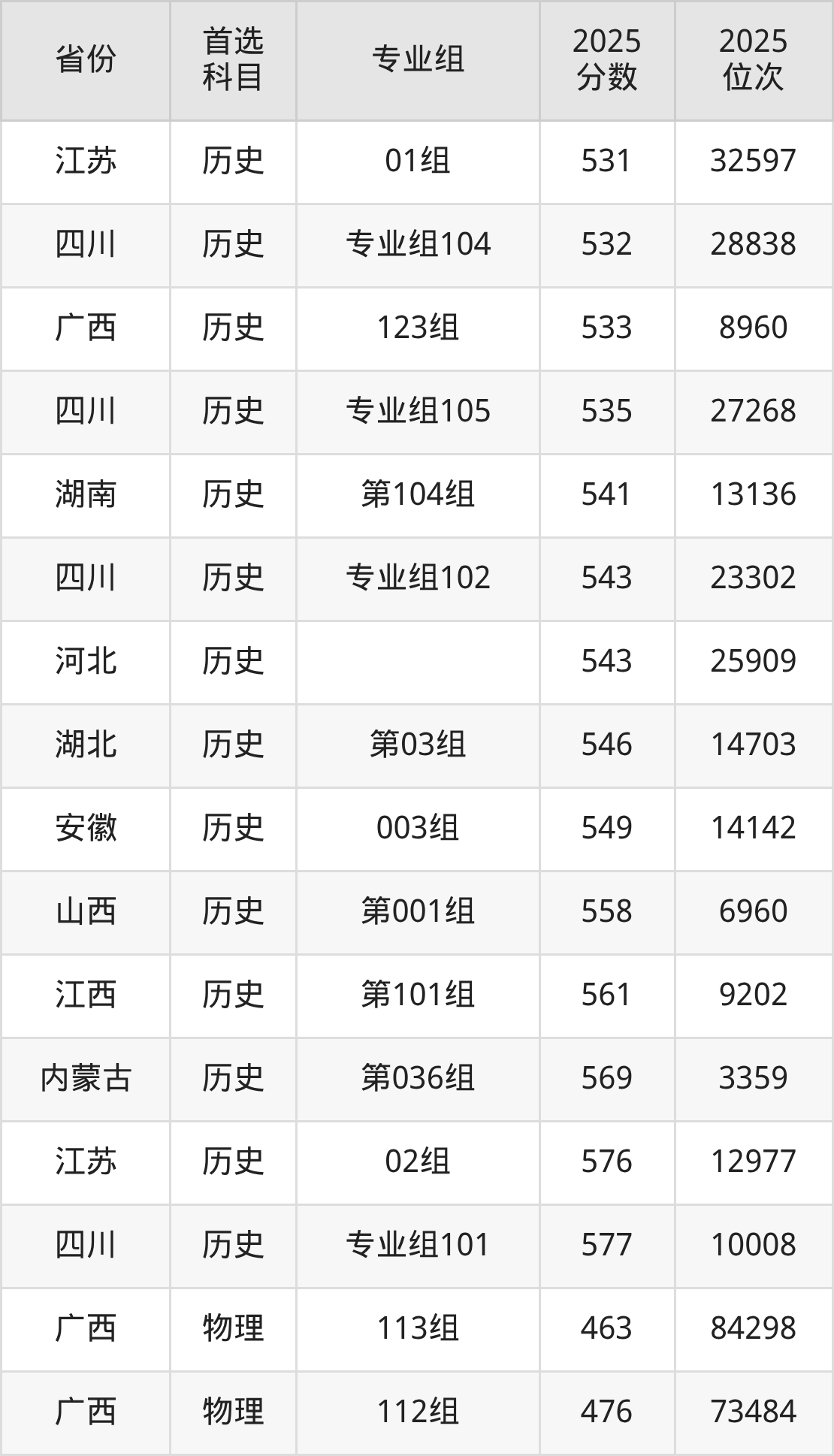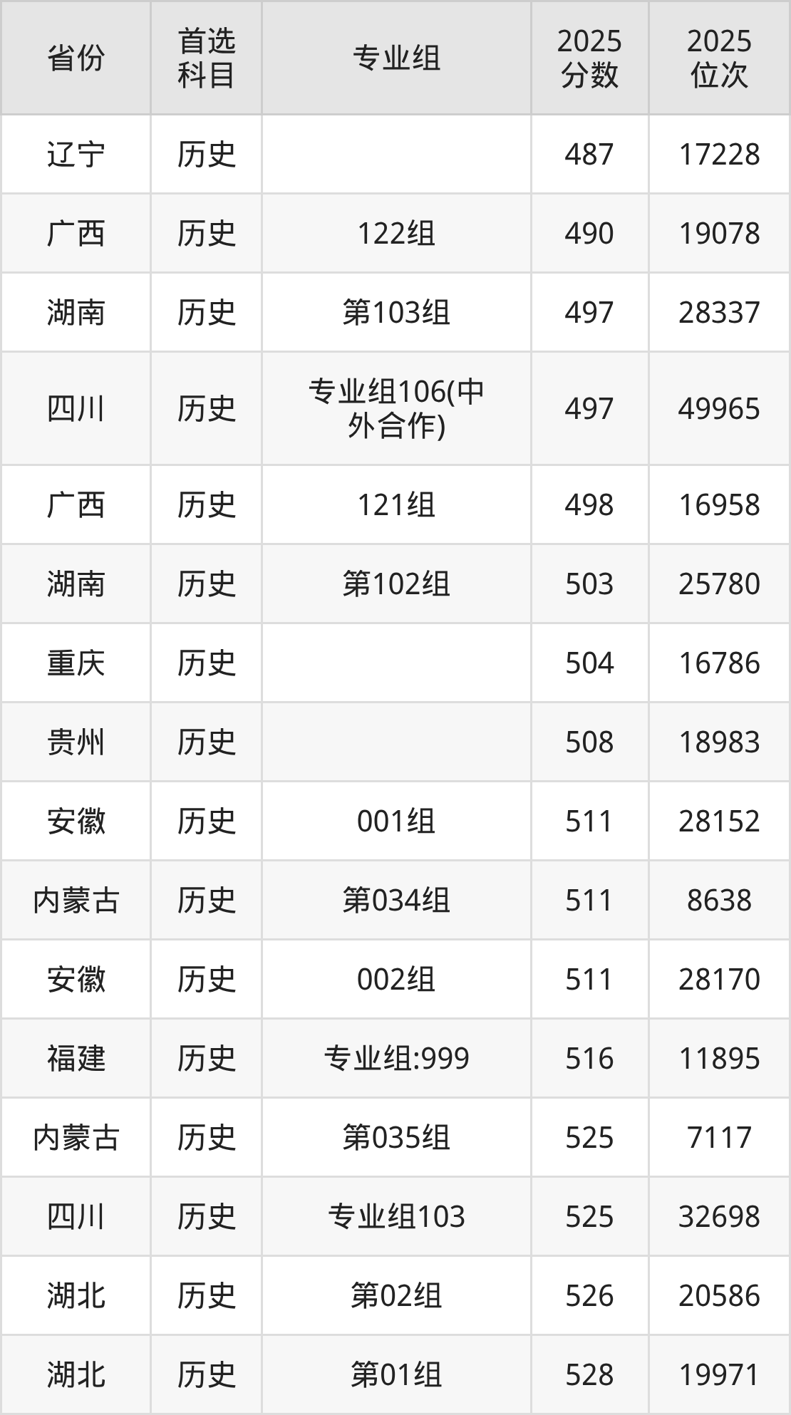 历史类:专业组101577分、10008名,专业组102543分、23302名,专业组103525分、32698名,专业组104532分、28838名,专业组105535分、27268名,专业组106(中外合作)497分、49965名;