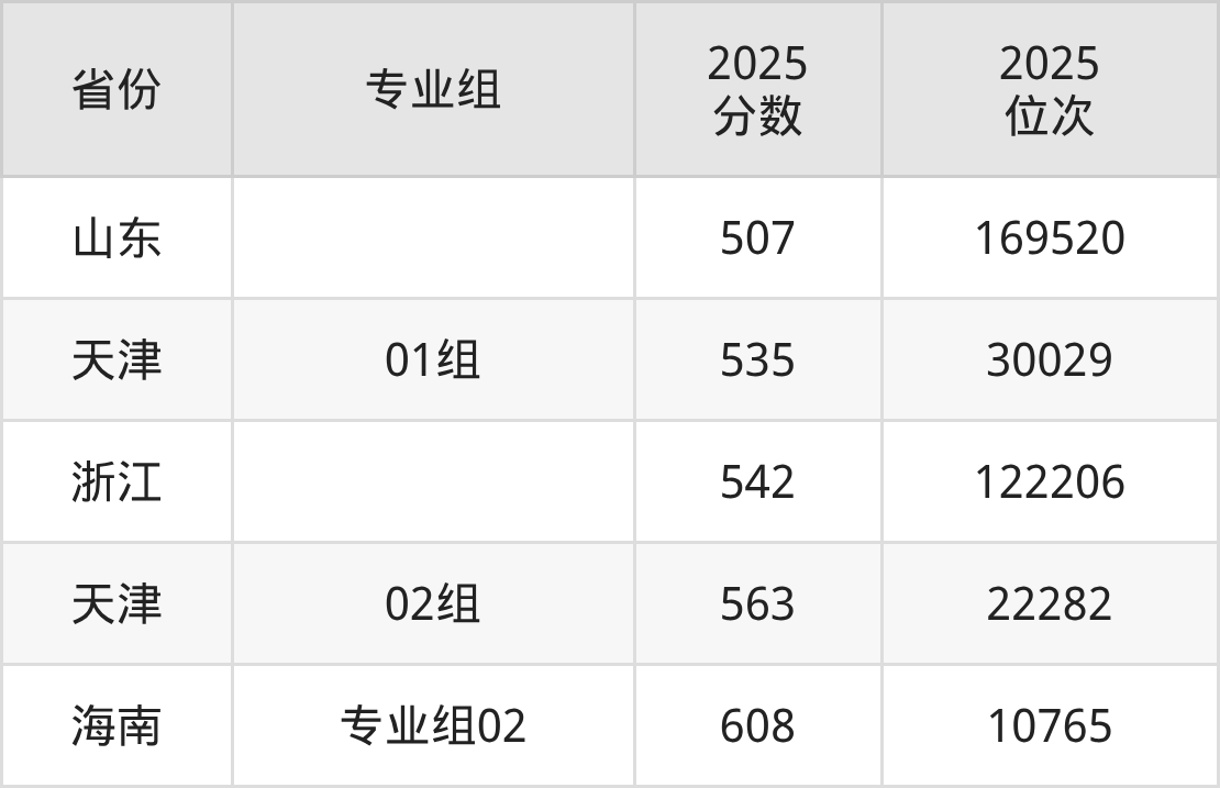 最低分对应地区为山东,录取位次为169520,超一段线66分;最高分对应地区为海南(专业组02),录取位次为10765,超本科线128分。